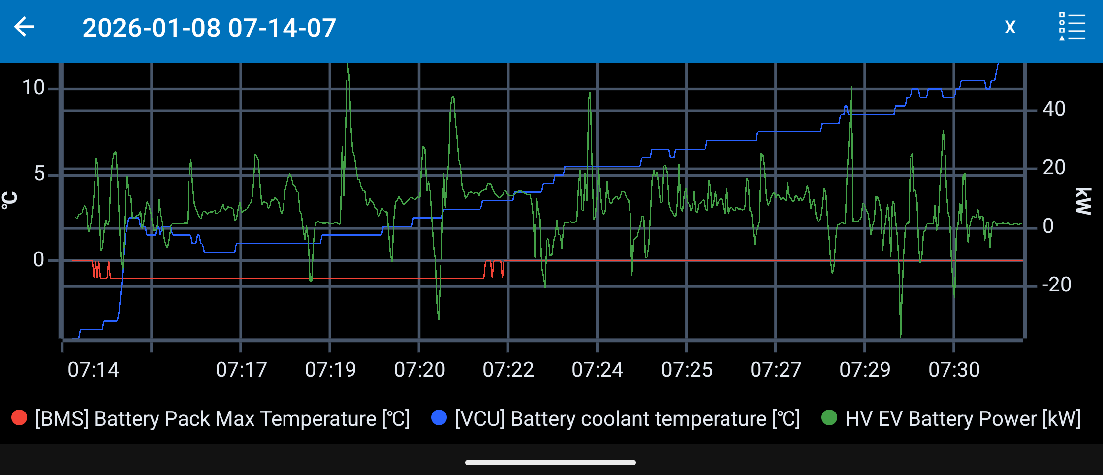 Wenn ich das auf deinem Diagramm richtig erkenne, war der Akku unter 0 Grad. Wohin soll den die RekuparationsEnergie? Das bedeutet doch der Akku sollte geladen werden. Unter 0 Grad darf der LFP Akku nicht geladen werden, auch nicht durch Bremsen.