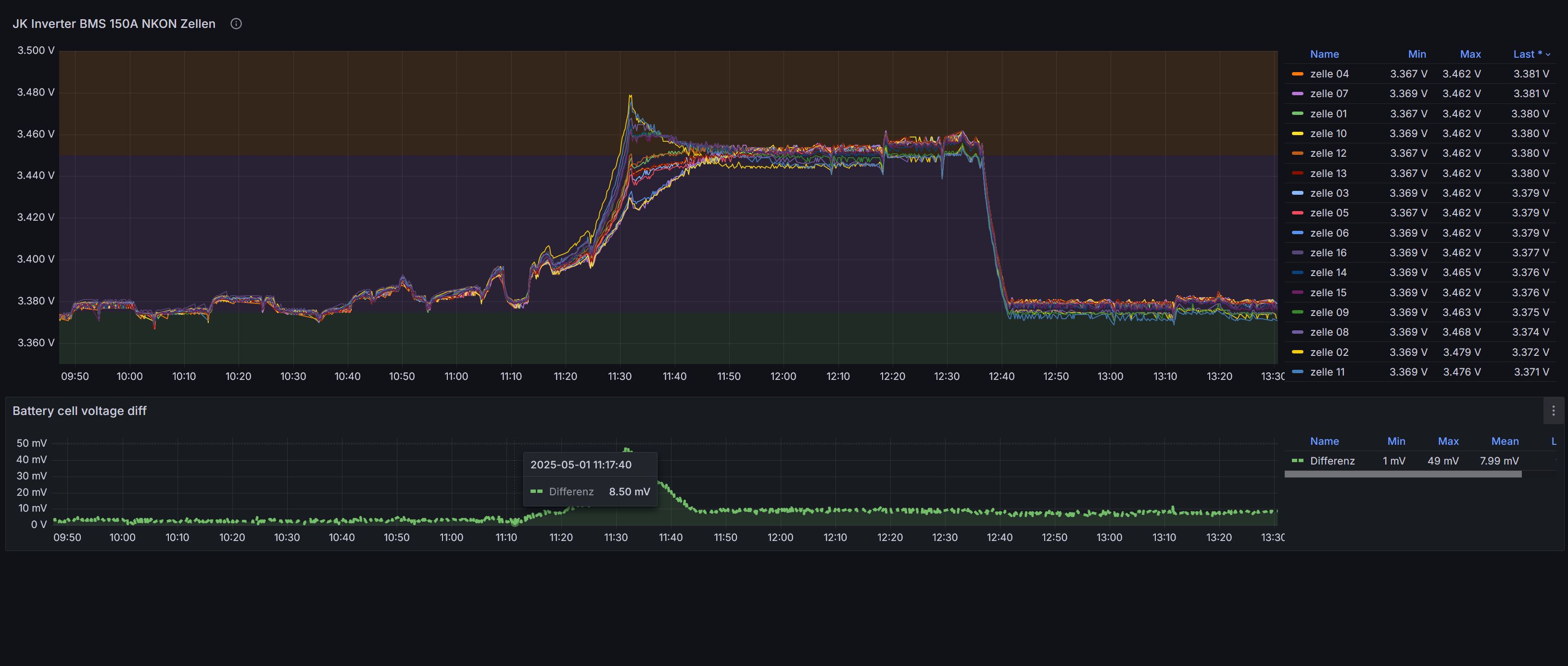 LFP Akku bis 3,65V Laden ist das absolute Maximum. Ich hoffe sobald die erste Zelle die 3,65V erreicht hat, geht der SoC auf 100%. Die Zellspannung fällt dann schnell wieder ab. Schlimm wäre, wenn er auf die Gesamtspannung des Packs referenziert und einzelne Zellen über 3,65V läd.