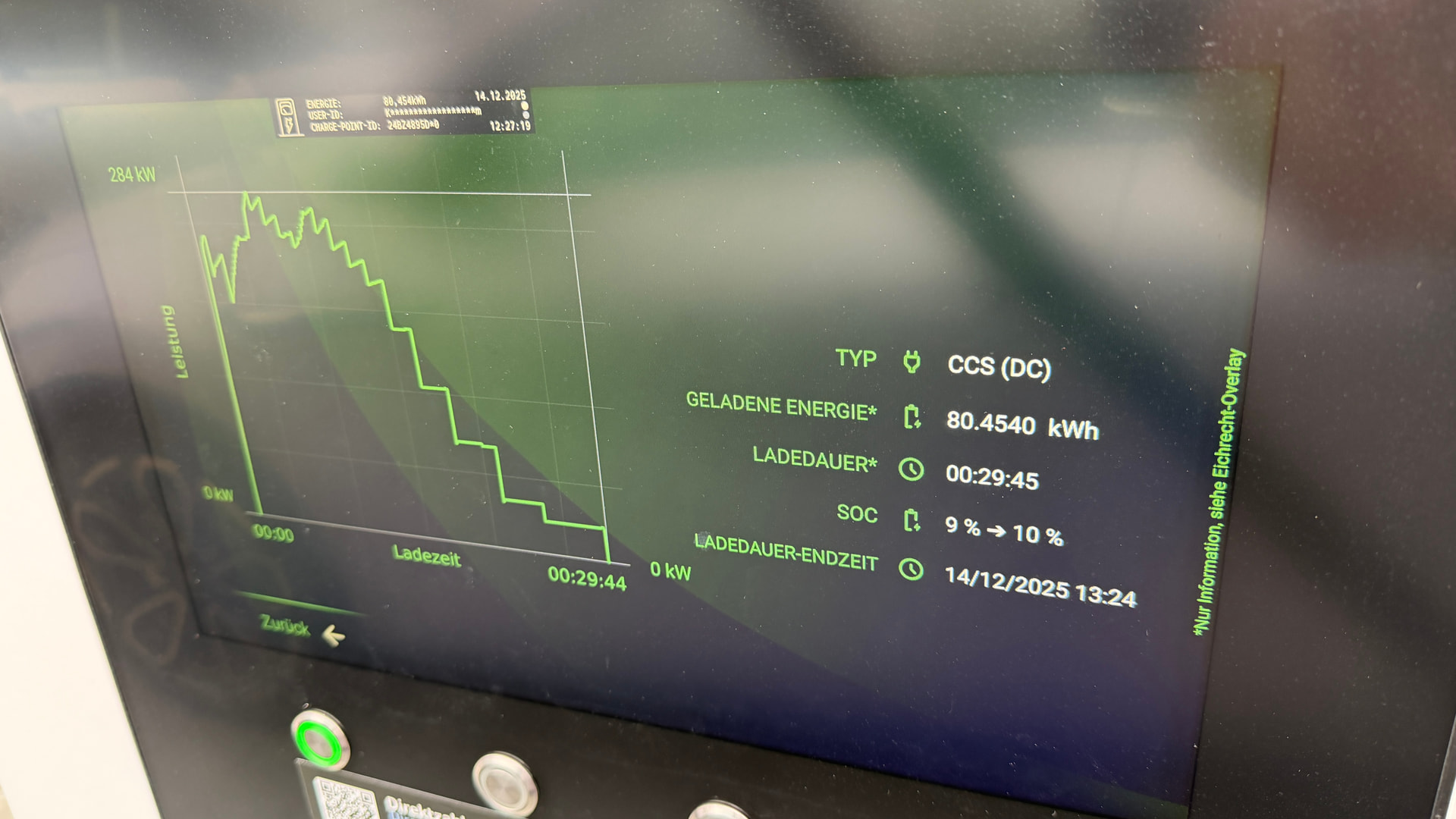 jedenfalls: die Ladeleistung ergibt sich aus Ampere (liefert die Ladesäule) und der Zellspannung des Autos (steigt während des Ladens leicht an). Beides miteinander multiplizieren und die letzten drei Nullen streichen, dann hast du die Ladeleistung in kW.