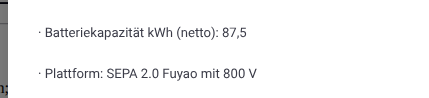 Ah okay, dann sind die 84,4 kWh vllt. die Kapazität zwischen 0-100% SoC und die 87,5 kWh einschl. dem Puffer unter 0% der theoretisch nutzbar ist