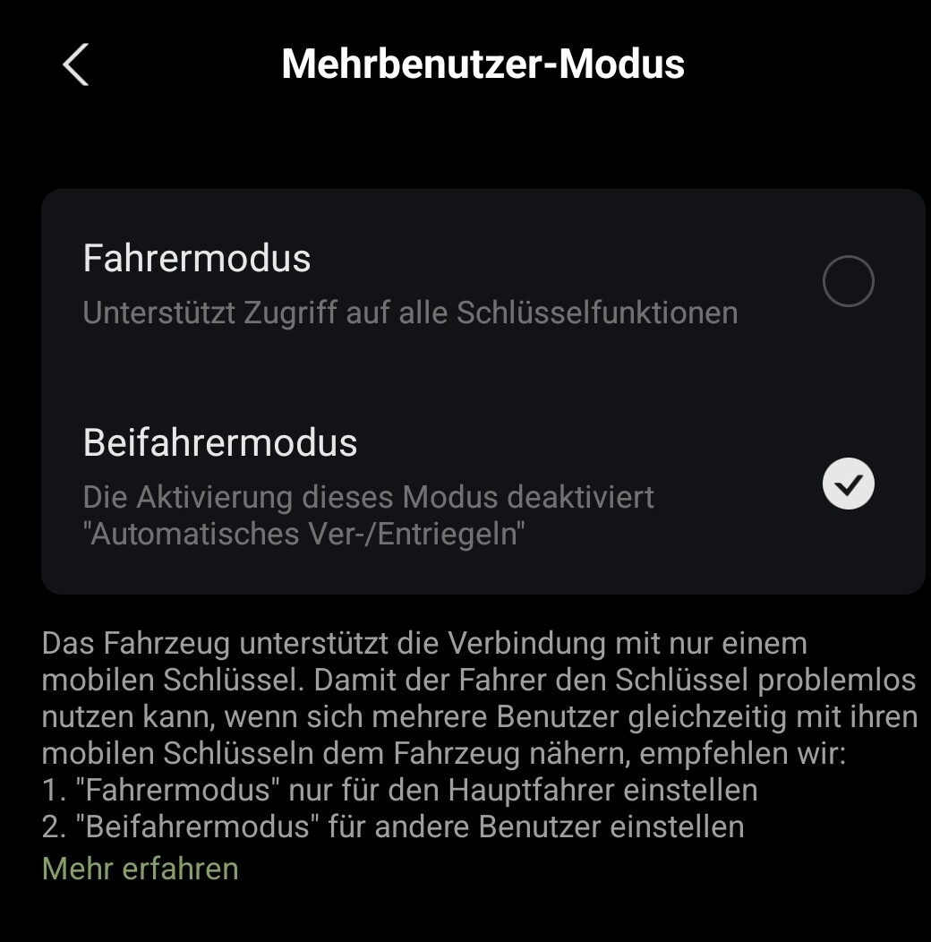 Das stellst du in der App auf Fahrermodus und das Auto öffnet sich. Wenn deine Frau auch in der Nähe ist, sollte sie auf Beifahrer gestellt haben.