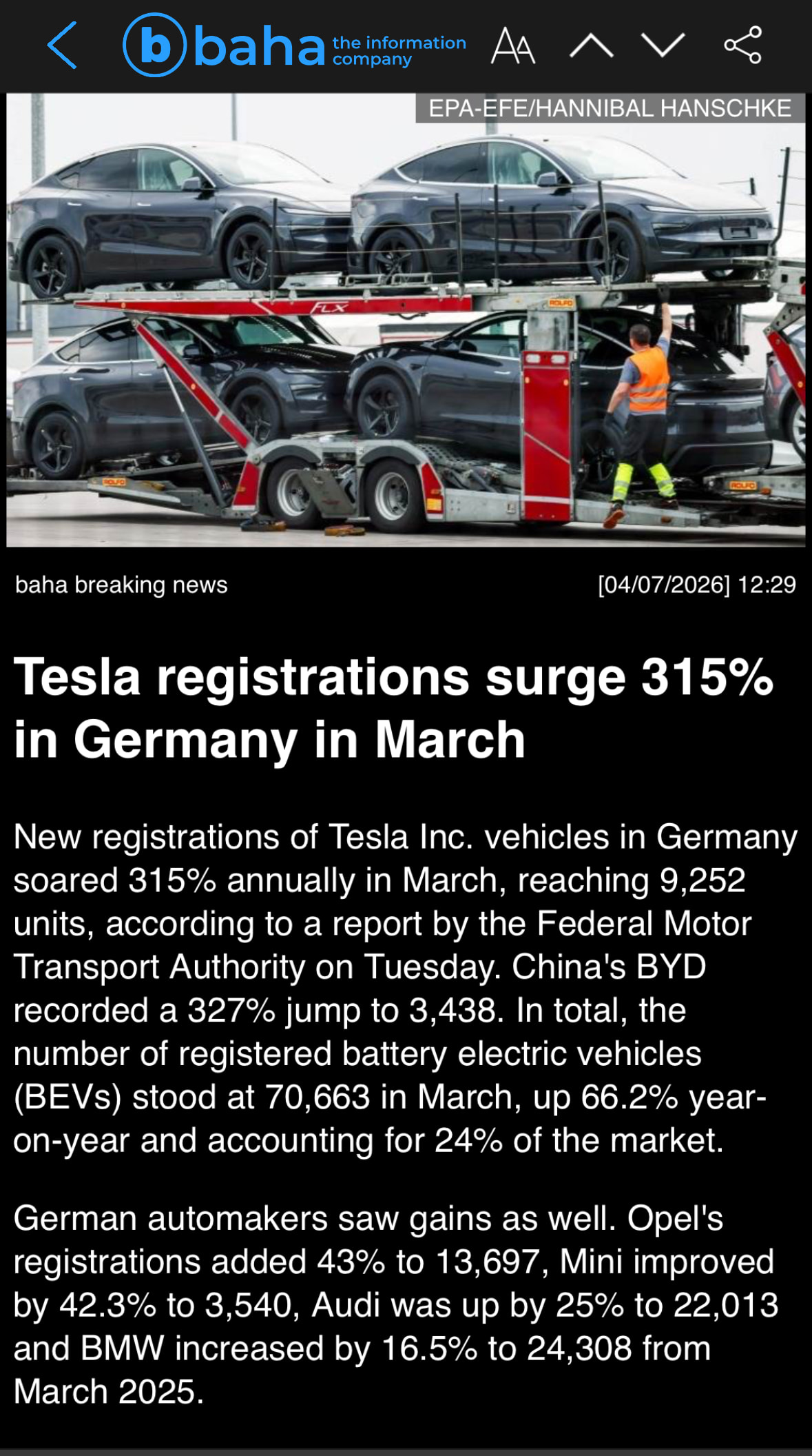 Im März wurden in Deutschland 70.663 neue BEV zugelassen, was eine Steigerung von 66,2 % YoY bedeutet. Die BEV hatten damit einen neuen Rekordanteil an den Neuzulassungen von 24 %. Damit wurden in Q1 in D 159.630 BEV zugelassen, was eine Steigerung um 42 % YoY bedeutet. Es geht rasant aufwärts in D.