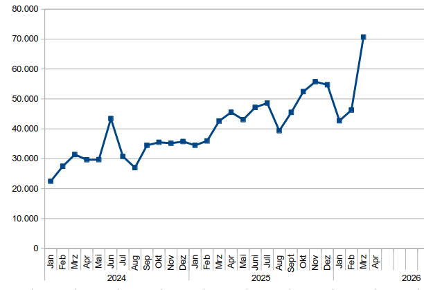 Die Neuzulassungen von BEV im März betrugen 70’663 Fahrzeuge, das war ein Anteil von 24% an den Gesamtzulassungen im März.