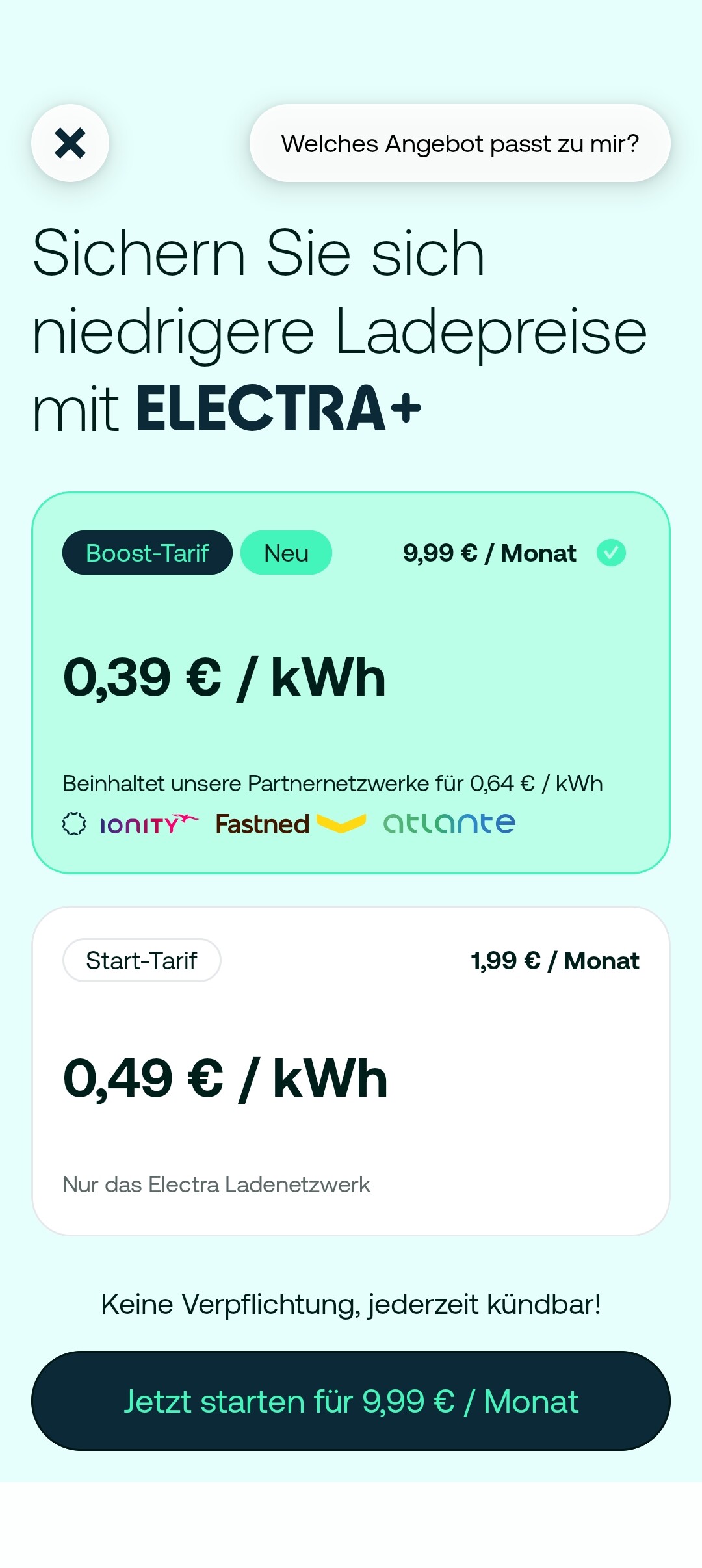 Aber da oben im Text steht doch „…Ein zweites Angebot für 1,99 Euro legt den Preis bei 0,49 Euro pro Kilowattstunde fest. Beide Tarife gelten an den Stationen der sogenannten Charge League, einem Zusammenschluss mehrerer Infrastrukturbetreiber, zu dem neben Electra auch Fastned, Atlante und Ionity zählen.“.