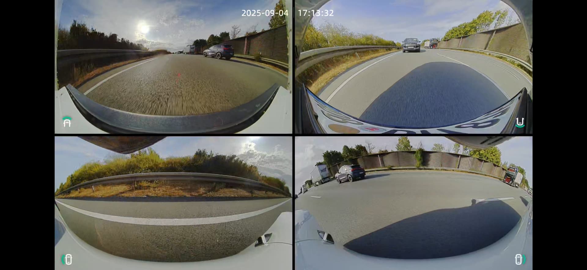 Das Fisheye verzerrt es natürlich extrem, aber der Streifen auf der Fahrbahn ist 3m lang. Das sind also allerbestenfalls 4m Abstand.