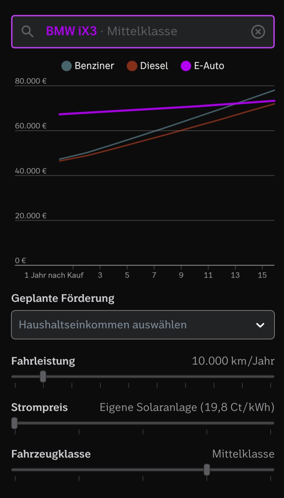 Der Vergleichsrechner ist gut. Gibt durchaus interessante Ergebnisse aus. Und mittlerweile sogar solche, dass das E-Auto bereits bei Kauf (ohne Förderung!) günstiger ist als vergleichbare Benziner oder Diesel. Es ist allerdings nur das „kleinste“ Modell/eine Variante auswählbar. Für einen Überblick reicht es.
