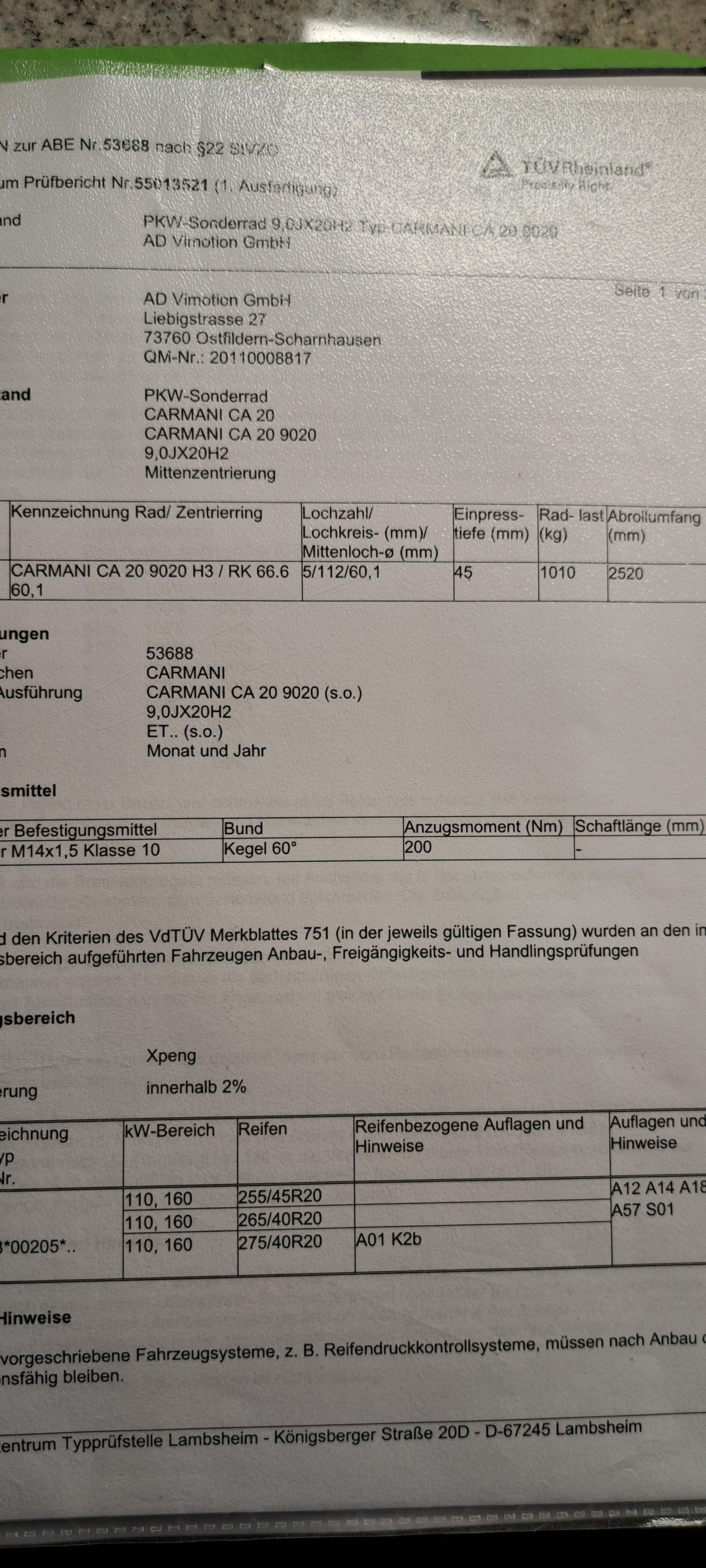 Ich kann noch mit einer Felge MSW 50 in 20“ dienen. 200 Nm mit Zentrierring. ach ja… G6.