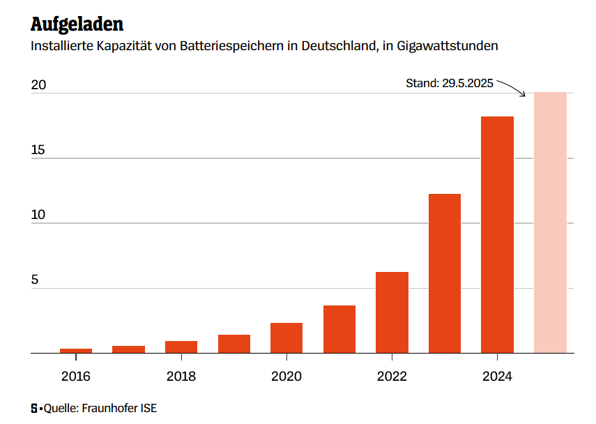 Hier eine Grafik mit den bislang installierten Speicher-Kapazitäten der Batteriespeicher. Ein vielfaches davon ist von vielen Firmen beantragt, aber die Bundesnetzagentur hinkt mit der Bearbeitung hinterher. Es wird nämlich auch geprüft, ob die beantragten Speicher der Stabilisierung des Netzes dienen. Je nach Installationsort kann es nämlich auch zu zusätzlichen Netzbelasungen führen, soweit ich weiß.