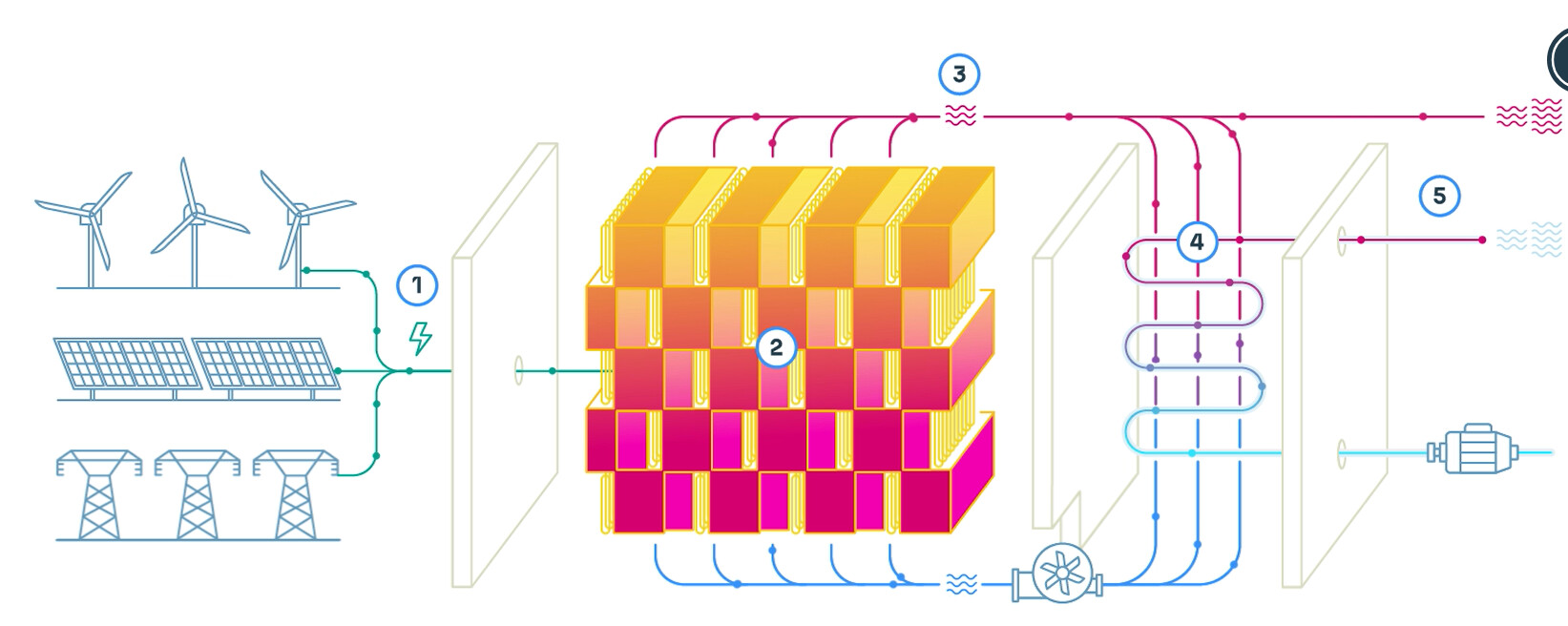 Mittels Wind- und/oder Solarstrom wird dort ein Wärmespeicher, bestehend aus speziellen Steinen von Rondo-Enery, auf rund 1.500 °C immer dann aufgeheizt, wenn ein Windstrom-Überfluss vorhanden oder der Strompreis besonders günstig ist. Mit diesem Speicher mit einer Speicherkapazität von 100 MWh kann dann ein beträchtlicher Teil der Dampferzeugung für das Covestro-Werk erfolgen. Der Bau der Anlagen hat gerade begonnen, die Fertigstellung ist für Ende d.J. vorgesehen. Hier das Arbeitsprinzip der Anlage: