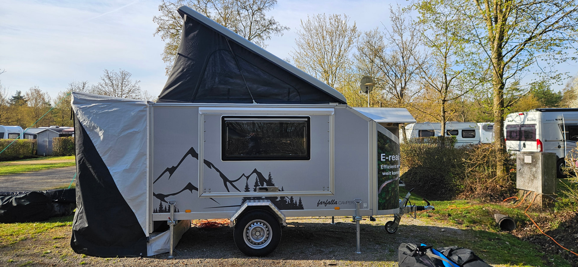 Nach etwas Recherche bin ich dann über den Flip Up von Farfalla Camper gestolpert. Der hat genau das, was mir gefehlt hat: Aufstelldach, dazu ein super durchdachtes, sehr pragmatisches Konzept. Klar, durch die Basis als Kofferanhänger wirkt er auf den ersten Blick nicht so „schick“ wie viele Teardrop-Minicaravans. Dafür ist er aber im Alltag mega praktisch: große Türen statt Mini-Einstieg, Platz für Fahrräder, Boote oder SUPs – genau unser Ding. Je mehr wir uns damit beschäftigt haben, desto klarer wurde: Der könnte richtig gut zu uns passen.