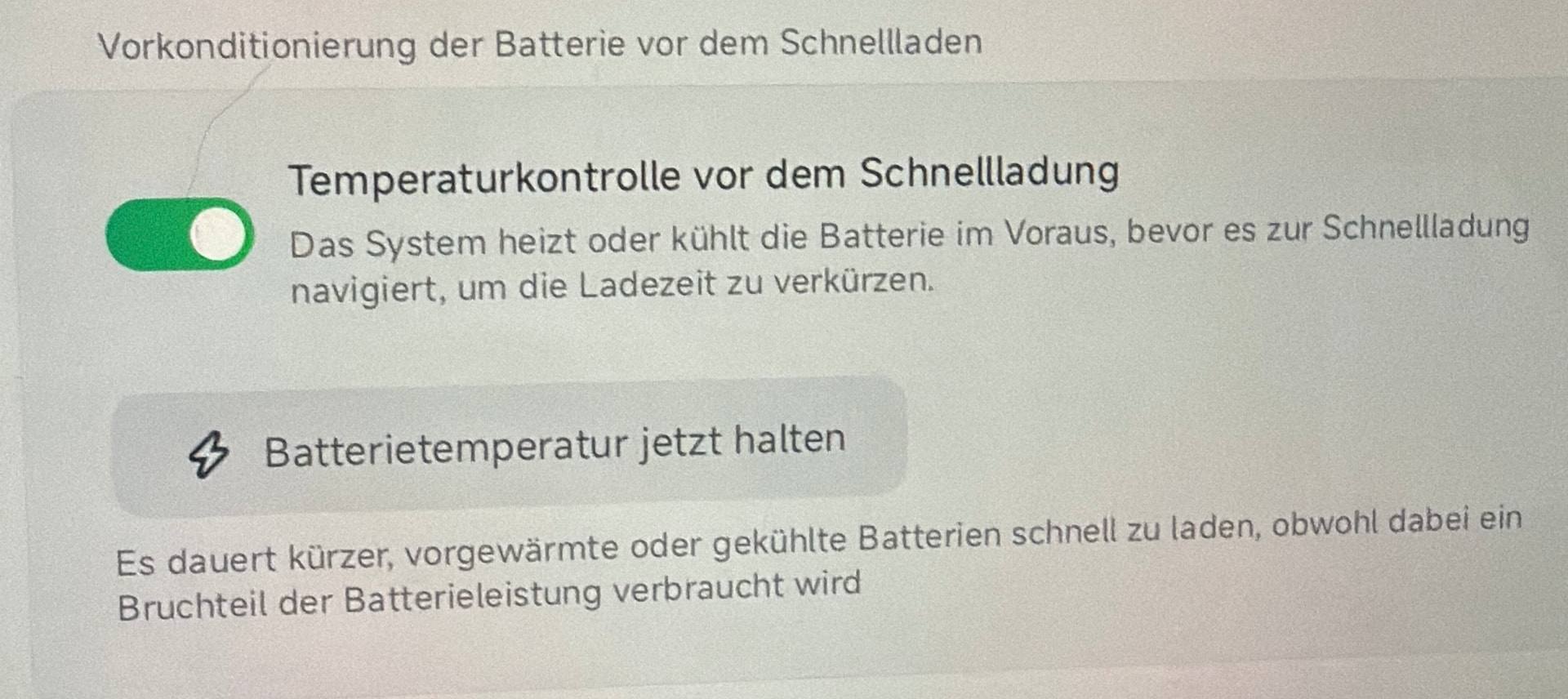 Während ich im Auto saß und die Einstellungen durchgegangen bin, ist mir die Option im Bild aufgefallen: „Batterietemperatur jetzt halten“. Ich habe dann recherchiert, dass man diesen Button wohl 10-20 Minuten vor Ankunft drücken sollte oder die Ladestation direkt im Navi als Ziel eingeben muss, damit der Akku vorkonditioniert wird. Das habe ich leider erst mitten im Ladevorgang entdeckt.