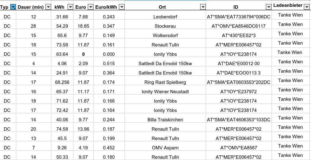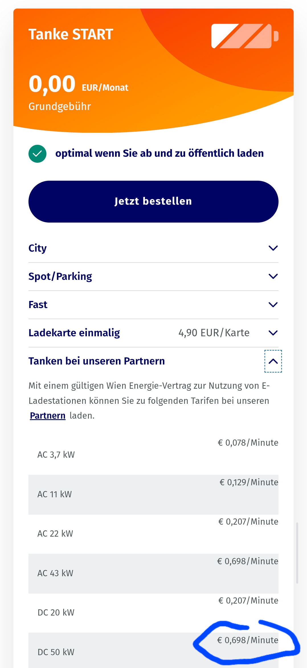 Für schnelles DC Laden am besten über den Tanke Wien Start Zeittarif laden, da kommst du auf 16-18ct/kWh, wenn die Bedingungen passen (Akku warm, allein an der Station, das Netz/die Ladestation gibt volle Power).