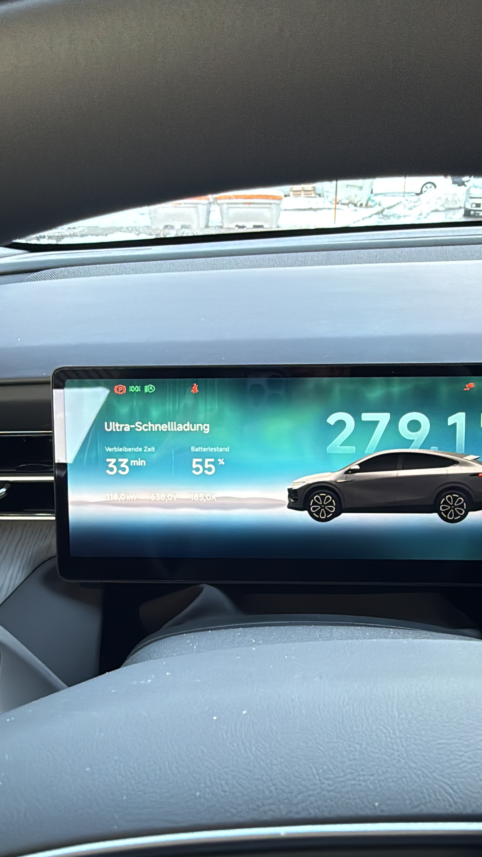 In dem Fall wäre die Rechnung ja so: Wenn ich eine 400 kW Säule finde, zahle ich den HPC-Minutentarif (z.B. 0,698 €/Min) und wäre bei der Ladeleistung des Xpeng in ca. 12-15 Minuten fertig. Mathematisch gesehen ist das bei der Menge an Strom, die ich in dieser kurzen Zeit bekomme, unschlagbar günstig.