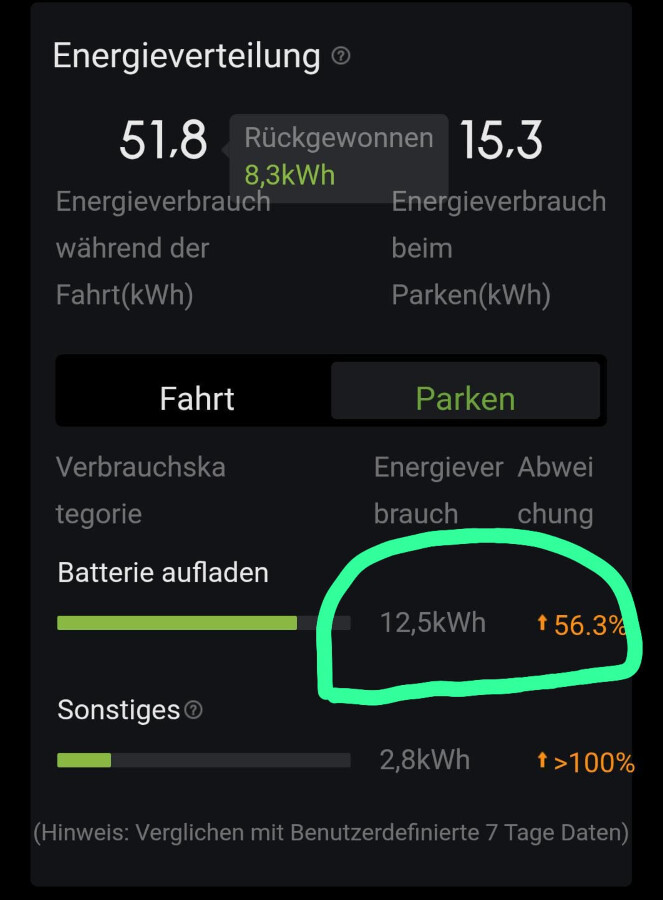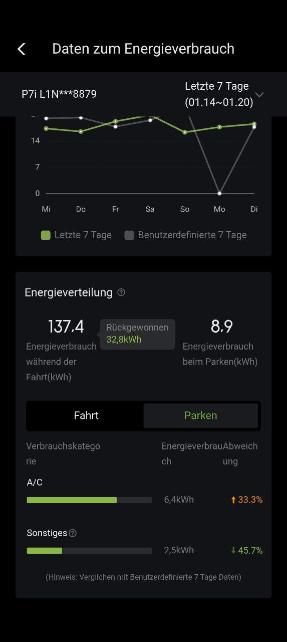 UPDATE: Ich habe mittlerweile alles, aber auch wirklich alles nach und nach ausgeschaltet, im Fahrzeug und auch in der App was geht. Carplay, Bluetooth, Öffnen bei Annäherung, Begrüßung bei Annäherung, Widget deinstalliert, die Xpeng App nach Benutzung immer hart geschlossen und den Digi-Schlüssel deaktiviert. Der Standby Verbrauch ist jetzt insgesamt deutlich gesunken. Richtig auffällig war meine letzte Maßnahme, das war das deaktivieren des Digi-Schlüssels. Der Tagesverbrauch ist jetzt auf 0,3 bis 0,8 kWh runter gegangen.