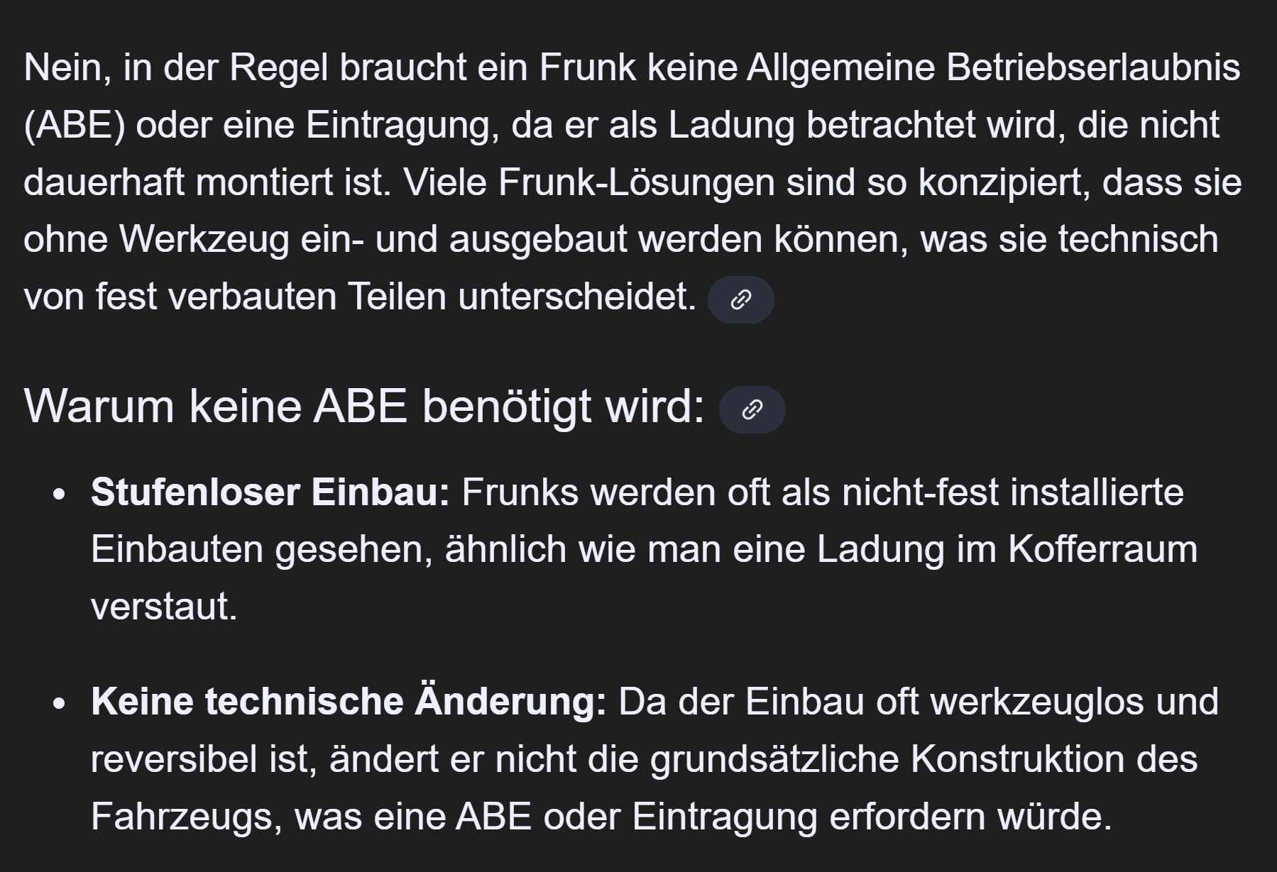 Deine Aussage ist falsch. Der Frunk wird mit dem Fahrzeug fest verbaut und genau das ist relevant, sowie auch Scheibentönung, welche auch fest mit dem Fahrzeug verbunden ist. Ich habe solch eine ABE