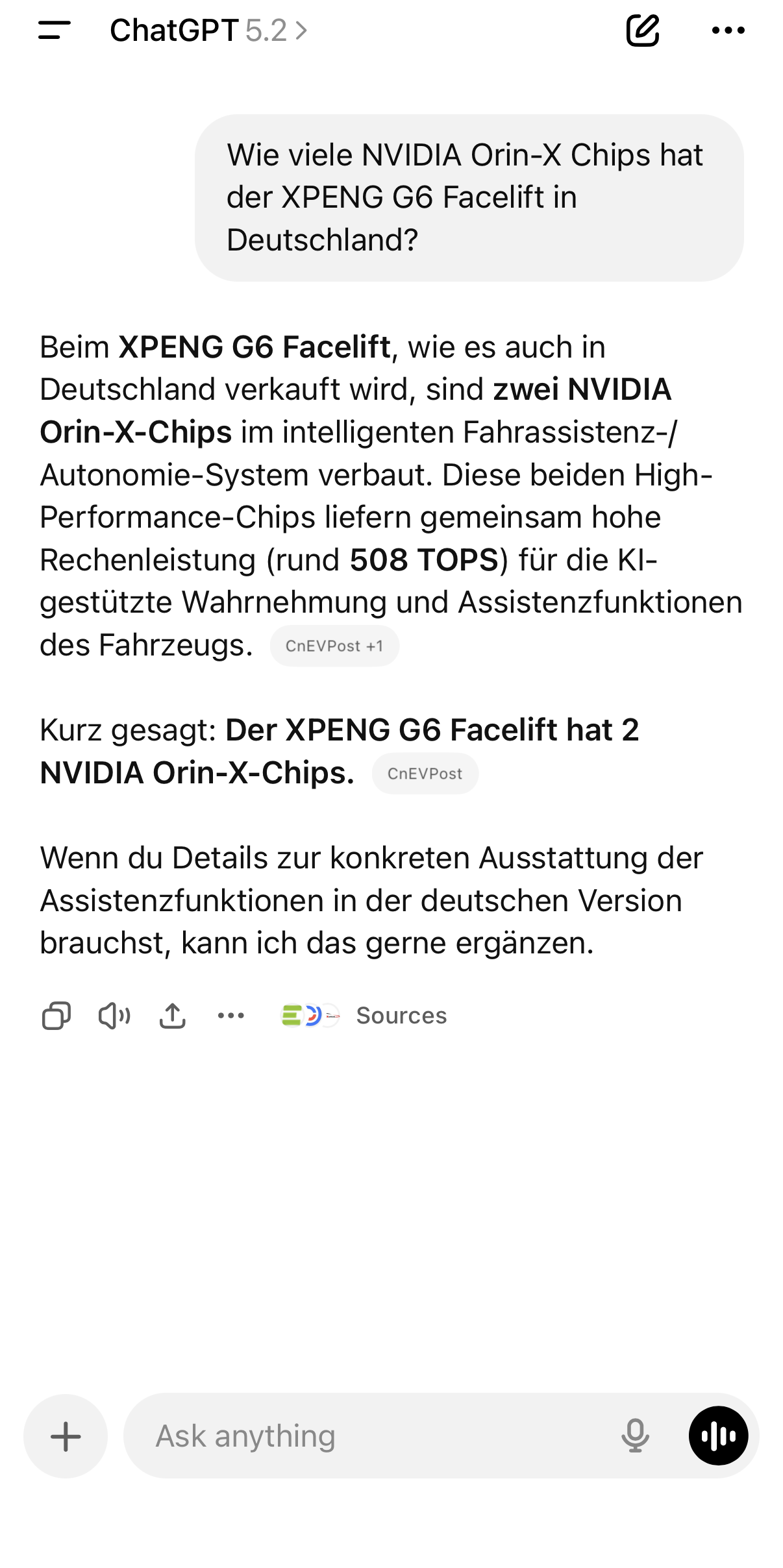 in den chinesischen Datenblättern steht 2x Orin-X, in den europäischen lediglich Orin-X, Lidar ist in den europäischen DB gar nicht aufgeführt. Muss mal schauen, ob ich dazu irgendwo was gespeichert habe - das sagt Gemini Pro dazu