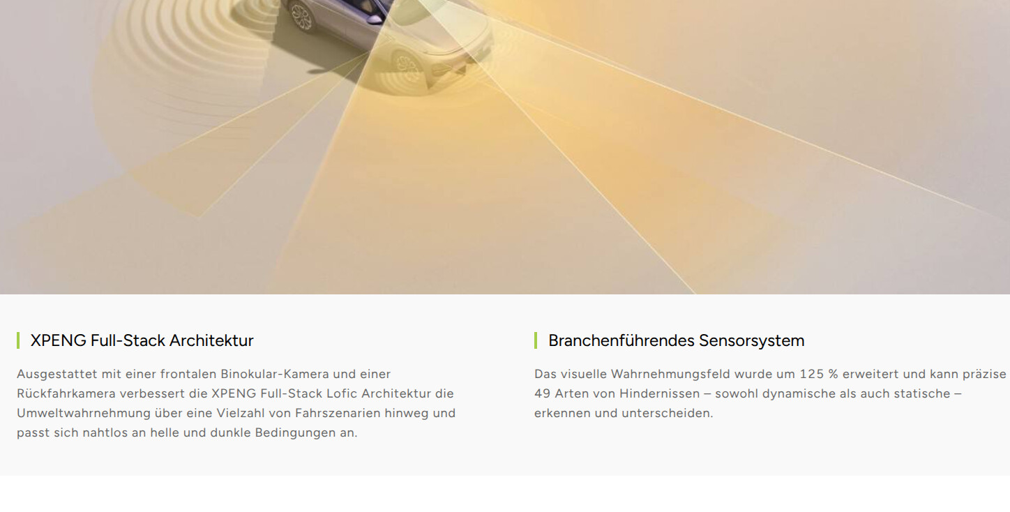 Zitat: “In terms of advanced driving assistance capabilities, the 2025 Xpeng G6’s Turing AI intelligent driving system is realized via front and rear 8-megapixel cameras, millimeter wave radar, and ultrasonic radar, powered by dual NVIDIA Orin smart driving chips to achieve urban and high-speed navigation on autopilot, as well as remote parking and straight line summoning.“
