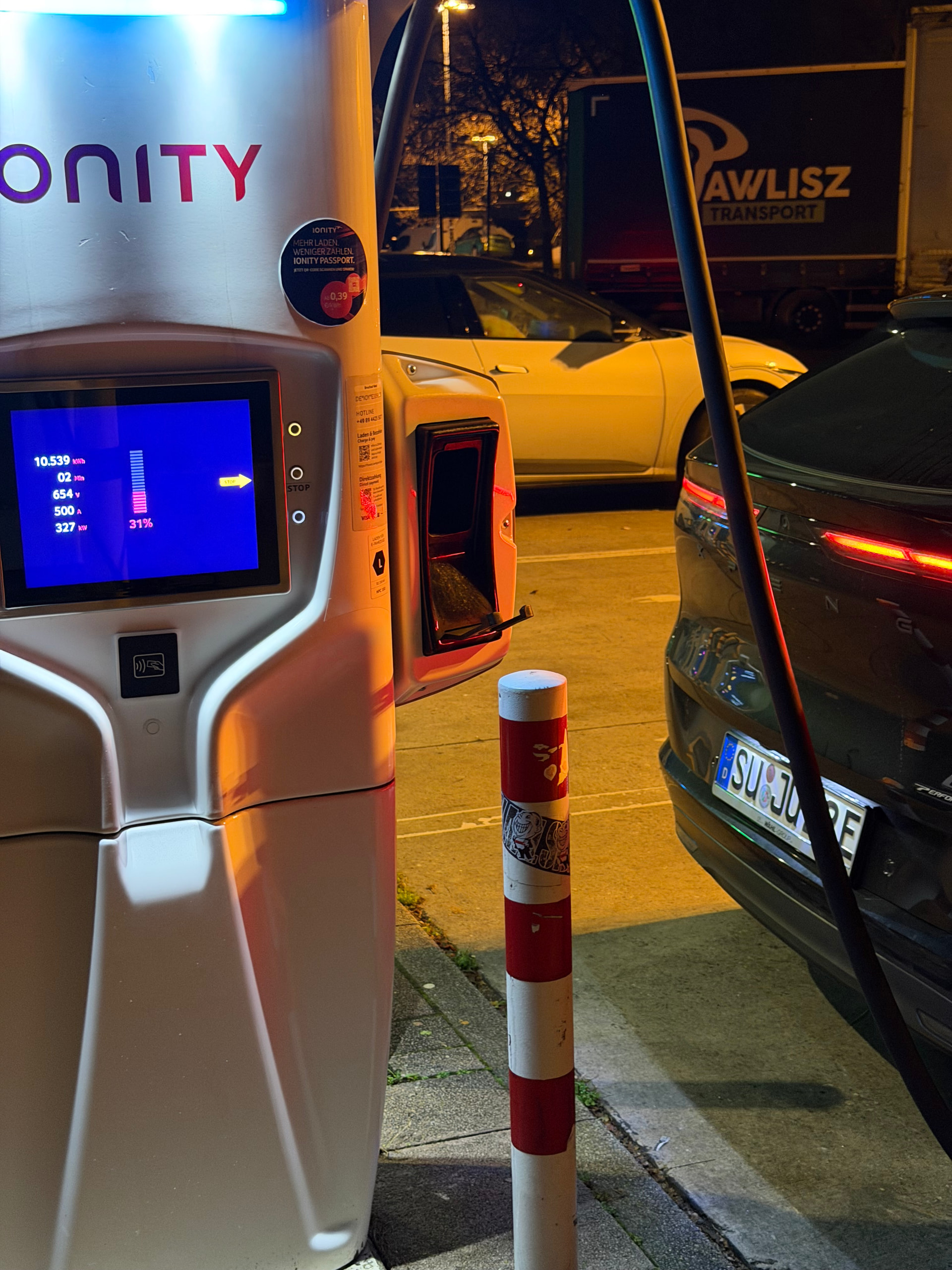 Die Ladeleistung ist wirklich toll, bei einem der 2 Ladestopps war ein Kia EV6 an der Säule nebenan, der nach 9min/52% mit 109kW vor sich hin lud, nach 5min/45% war er noch bei 68kW… Dabei hätte er mit seinem 750V System an dem 500A Charger richtig abräumen können…wenn seine Akku-/Ladetechnik was getaugt hätte.