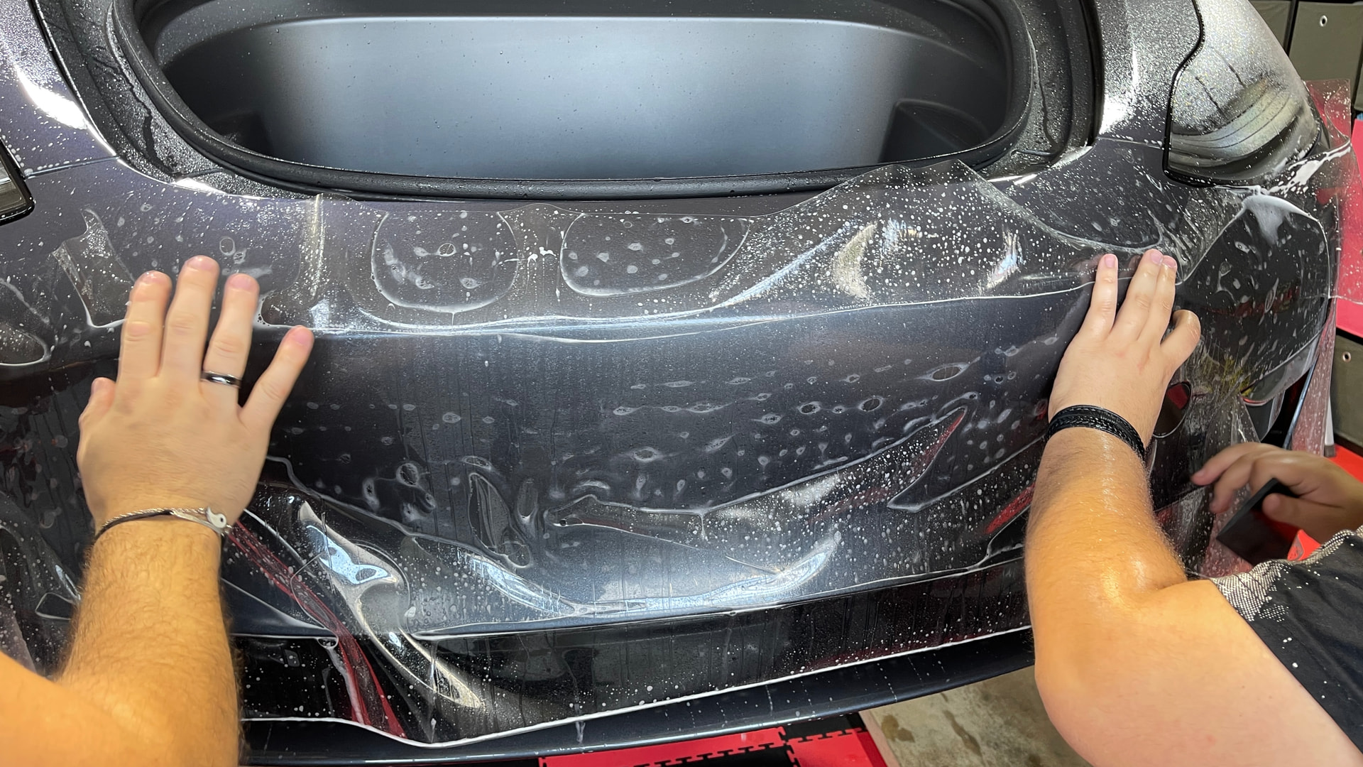 Dann möchte ich noch einmal darauf eingehen dass ihr versuchen wollt die Folie selbst zu verkleben. Alleine das Verkleben ist gar nicht so einfach. Ich habe es jetzt schon mehrfach versucht aber es ist als ungeübter wirklich sehr schwierig die Folie dreidimensional zu verkleben. Es sieht auch bei mit immer sehr einfach aus wenn der Folierer sowas macht aber wenn man es selbst versucht klappt das nicht so wie erhofft. Nicht nur weil das Verkleben an sich schwierig ist, sondern auch weil man das Mischungsverhältnis der Verklebungsflüssigkeit nicht genau abstimmen kann. Es wurde hier erklärt dass man hierfür Isoprop mit Wasser gemischt verwendet. Ja, das stimmt soweit aber ich kann Euch sagen dass auch mein Folierer viel experimentiert hat mit dem richtigen Mischungsverhältnis bis er dann zufrieden war. Und selbst er verwendet verschiedene Mischungen von unterschiedlichen Mittelchen um ein gutes Ergebnis zu erzielen. Manchmal braucht man mehr Gleitfähigkeit, manchmal mehr Klebeleistung. Das ist von Bauteil zu Bauteil, von Folienstück zu Folienstück unterschiedlich.