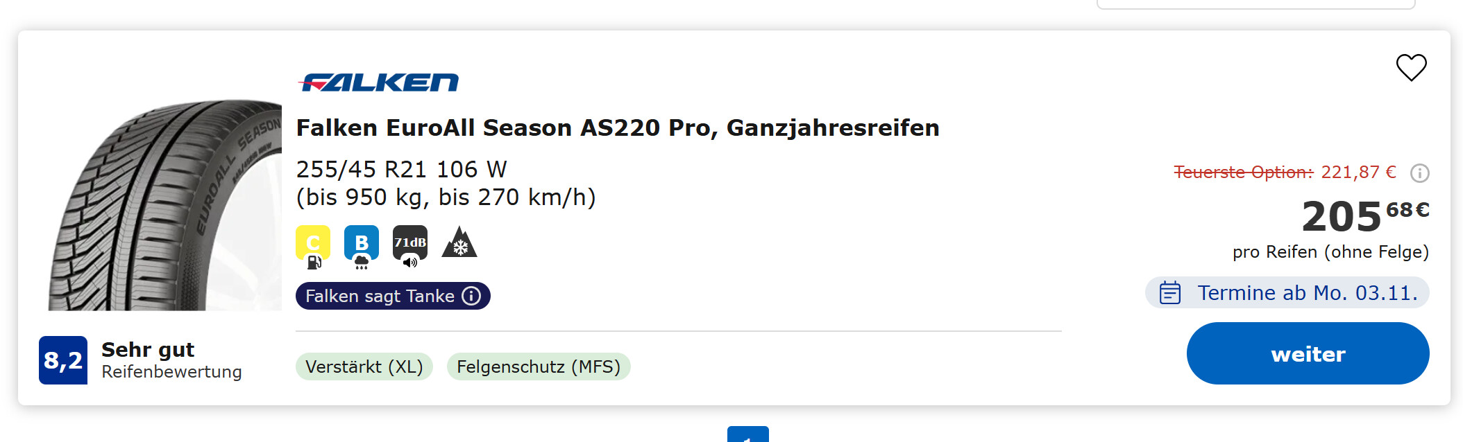 Ich wollte heute meine Falken Ganzjahresreifen für den G9P bestellen. Ich musste feststellen, dass bei keinem Reifenhändler, auch nicht online, die Reifen lieferbar sind. Ich habe daraufhin beim Hersteller angerufen und mir wurde mitgeteilt, dass die Reifen in der Größe 255/45/21 momentan nicht mehr produziert werden können und wahrscheinlich erst im März 2026 wieder Ware verfügbar sein wird.