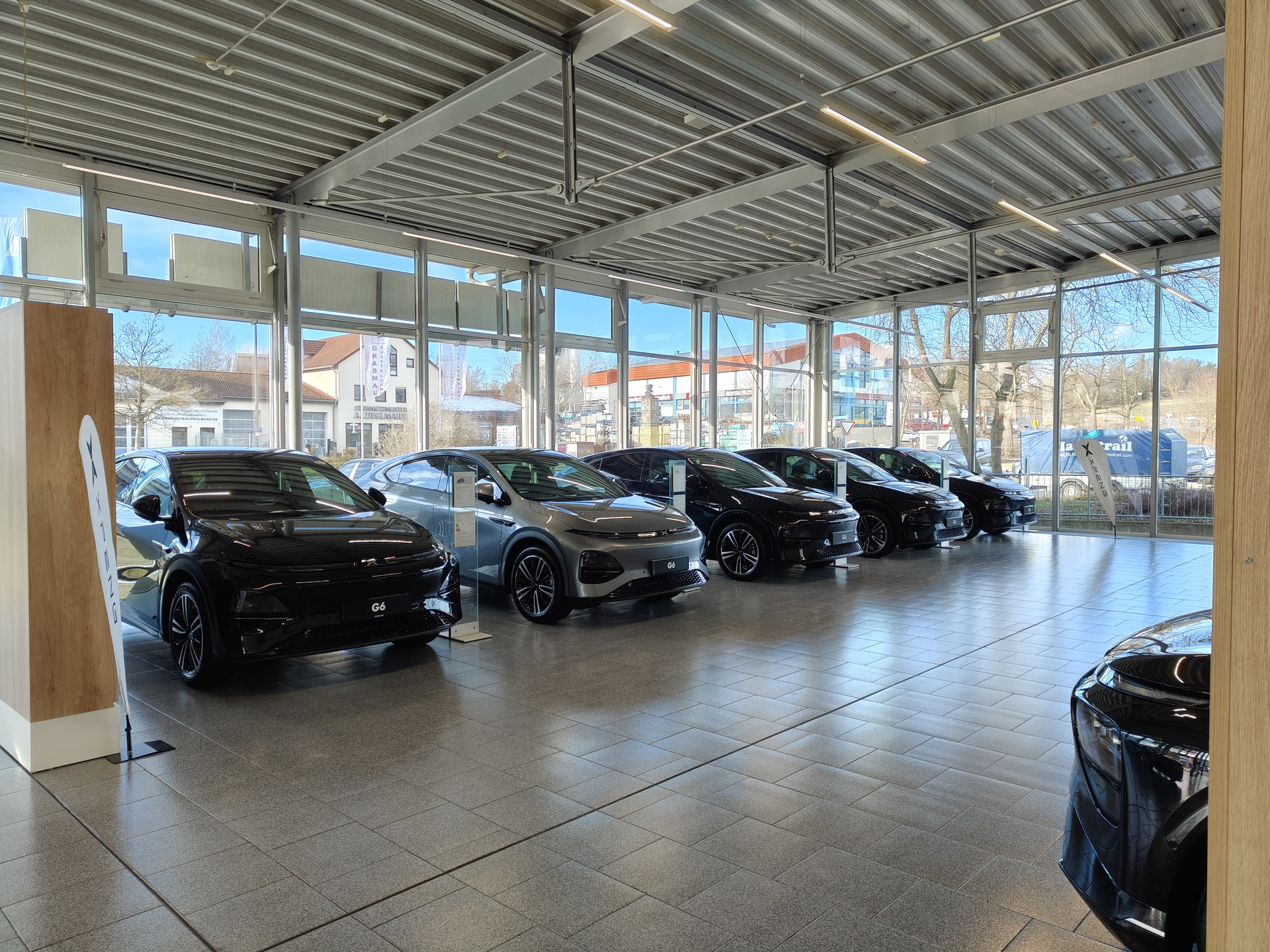 Der Xpeng-Bereich bei Hofmann in Pfaffenhofen sieht so aus. Eine Reihe Autos (alle verschlossen) und rechts eine lange Theke mit einem Bildschirm. Auf dem läuft 24/7 “Xpeng-Propaganda” .