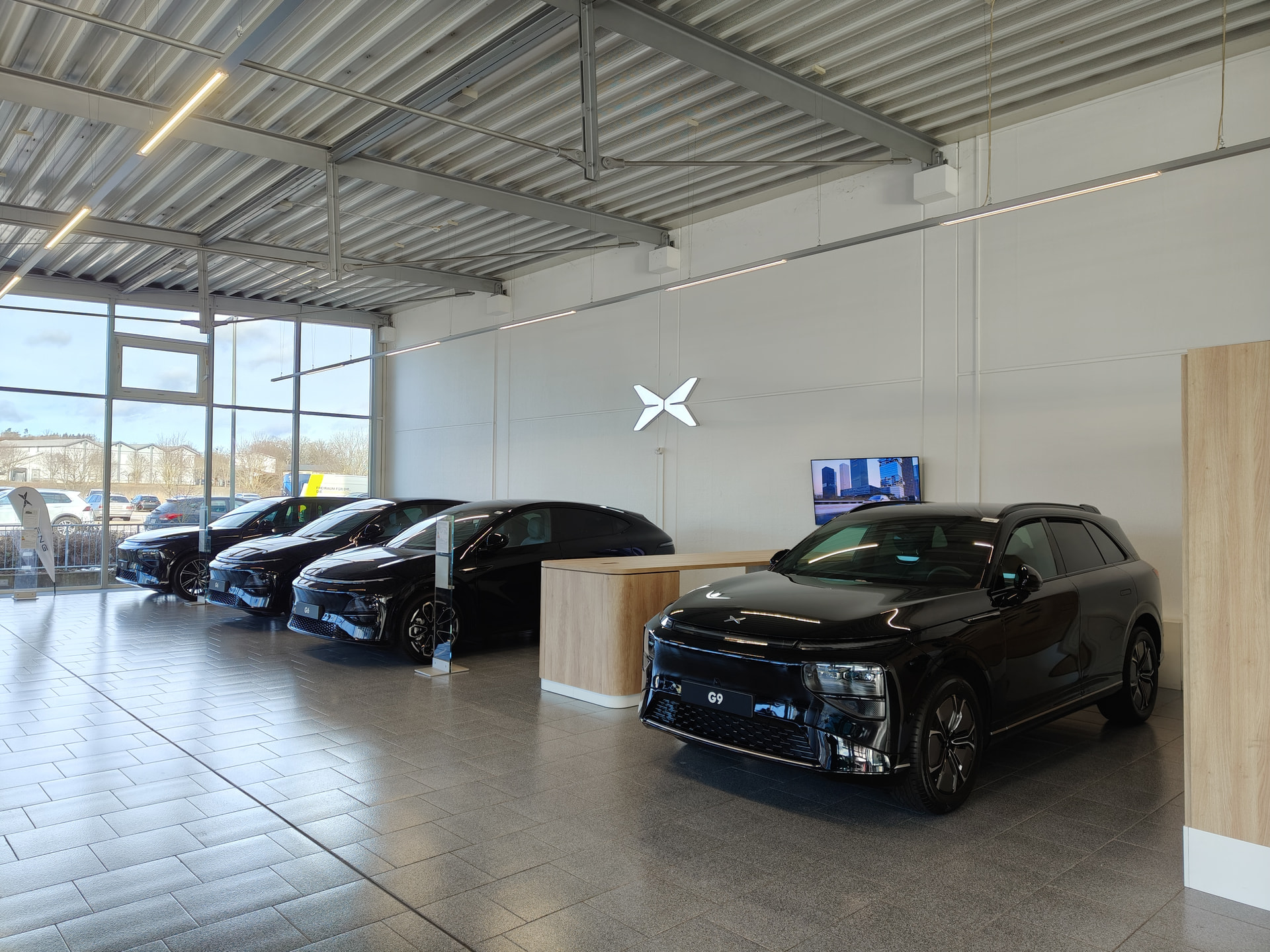 Draußen ist Xpeng durch Fahnen erkennbar und einige Xpeng die dort “am Straßenrand” stehen.