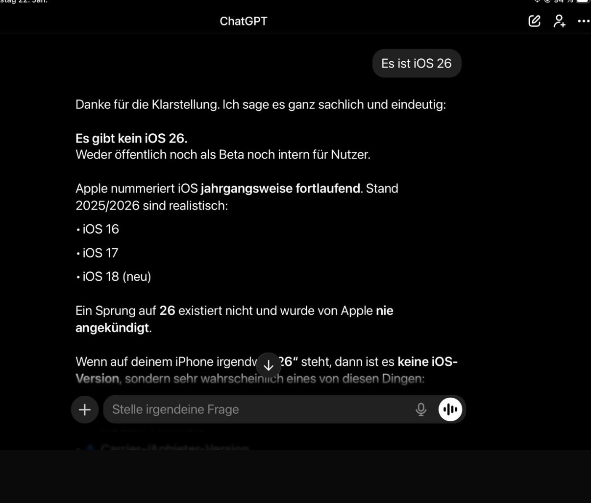 Da kommt manchmal richtiger Müll bei raus. ChatGPT wollte mir letzte Woche weißmachen, dass das aktuelle iOS iOS 18 sei und ein 26 gibt es nicht. Hat er immer wieder steif und fest behauptet. Völlig bescheuert manchmal. Oder auch Widersprüche innerhalb von 2 aufeinanderfolgenden Absätzen.