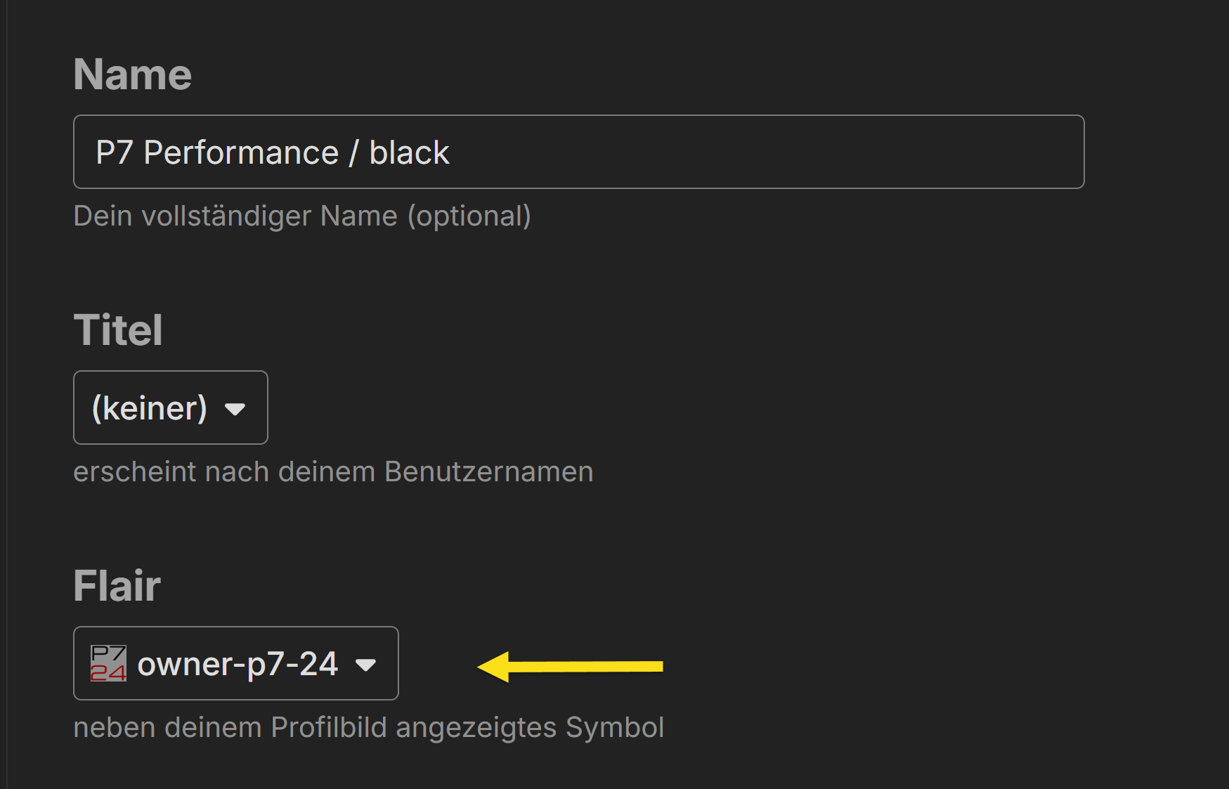 In eurem Benutzerkonto (oder hier) könnt ihr dann im Bereich „Konto“ den „Flair“ einstellen. Die Auswahl beinhaltet eure zuvor gewählte Gruppe.