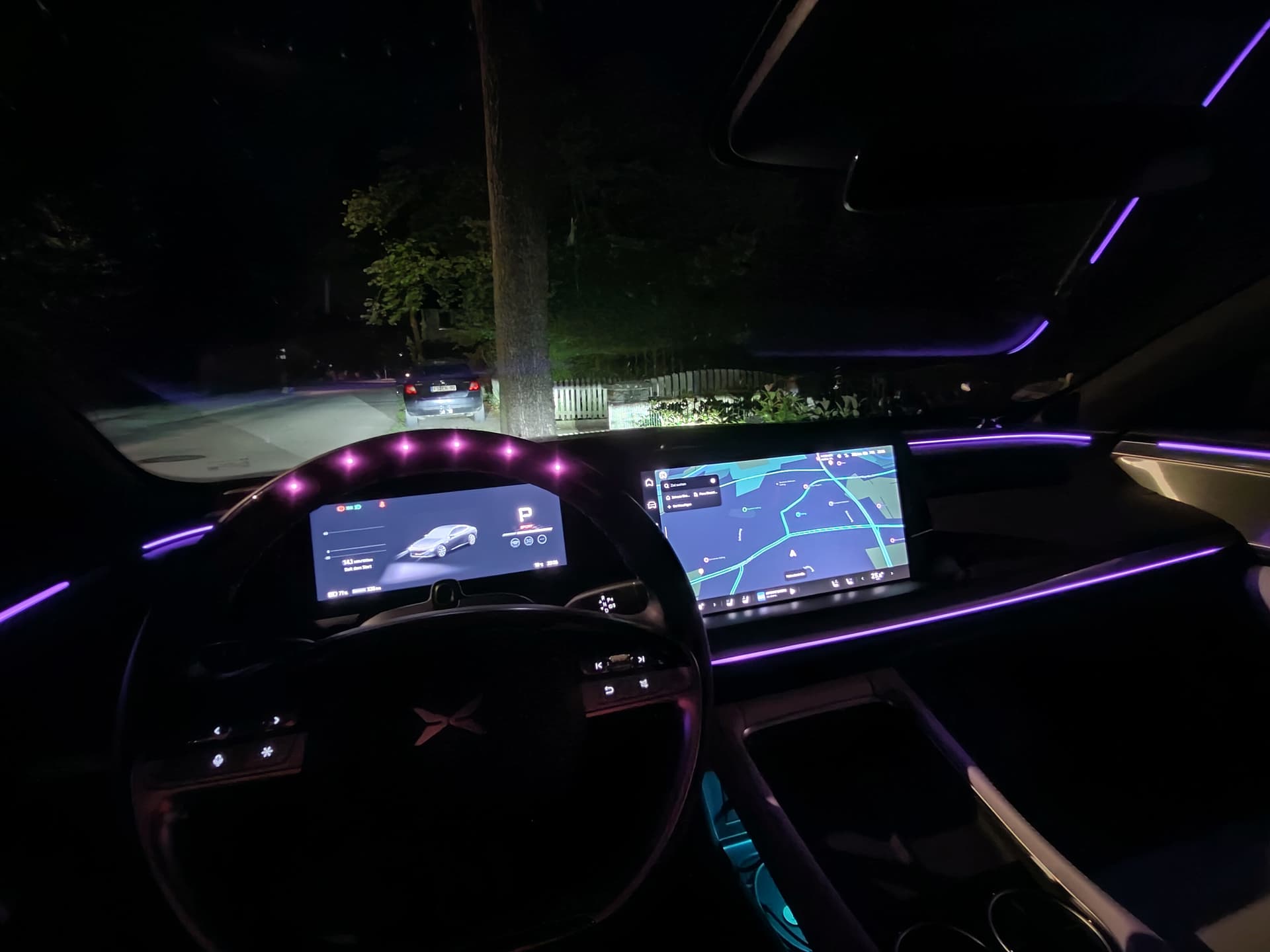 - „Hey XPENG, Ambientebeleuchtung ändern“ / „Ambientebeleuchtung auf Blau“