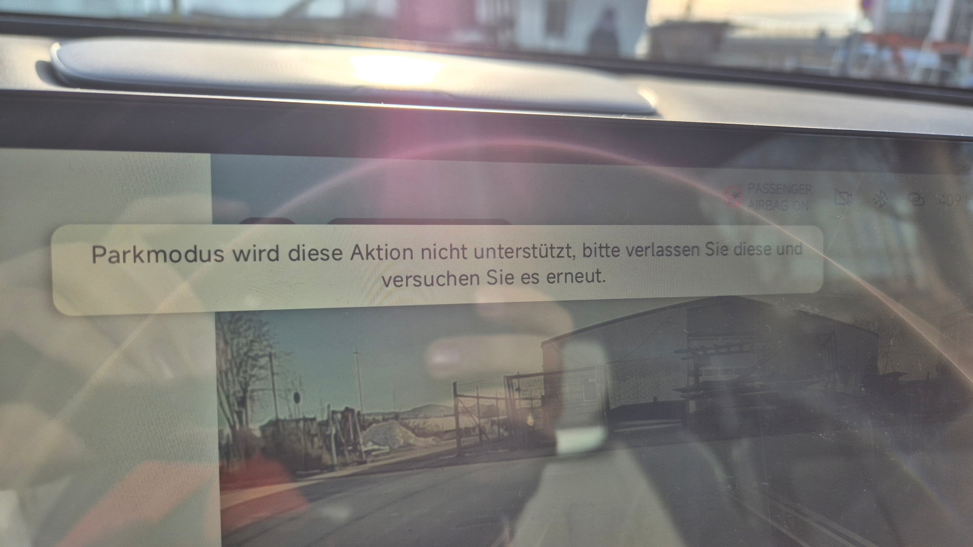 Hier ein Foto mit dem Hinweis. Zu sehen ist nur der Umfeldmodus links (hat so einen komplizierten Namen ist mir entfallen) und die Frontkamera. Das lässt sich erst ändern, wenn man links den Parkmodus, der im vorgenannten Umfeldmodus nach Parkplätzen sucht, deaktiviert hat.