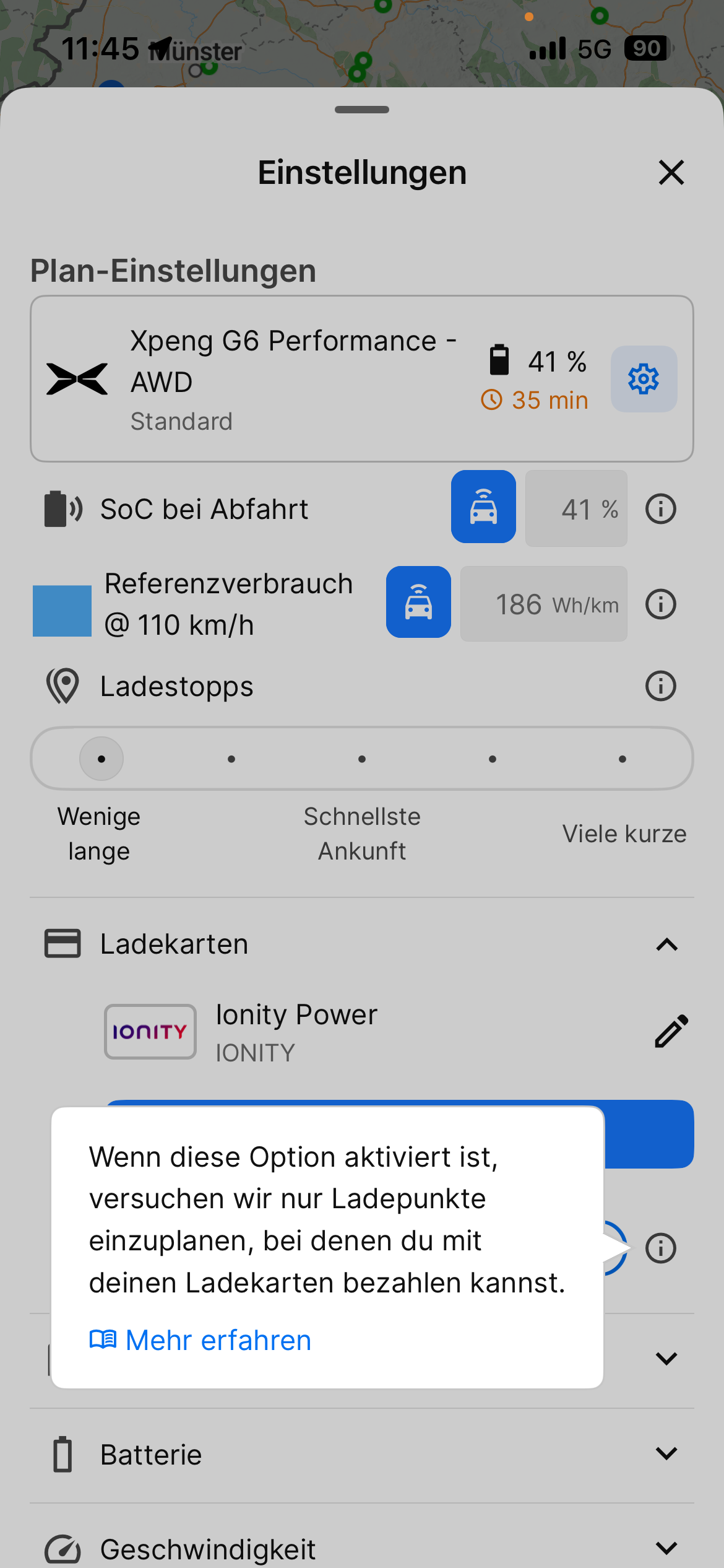 Mit Ankunft min Akku in % und Akku vorheizen für Laden usw.