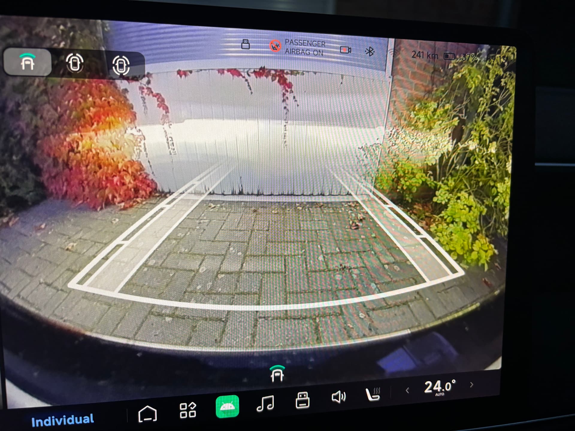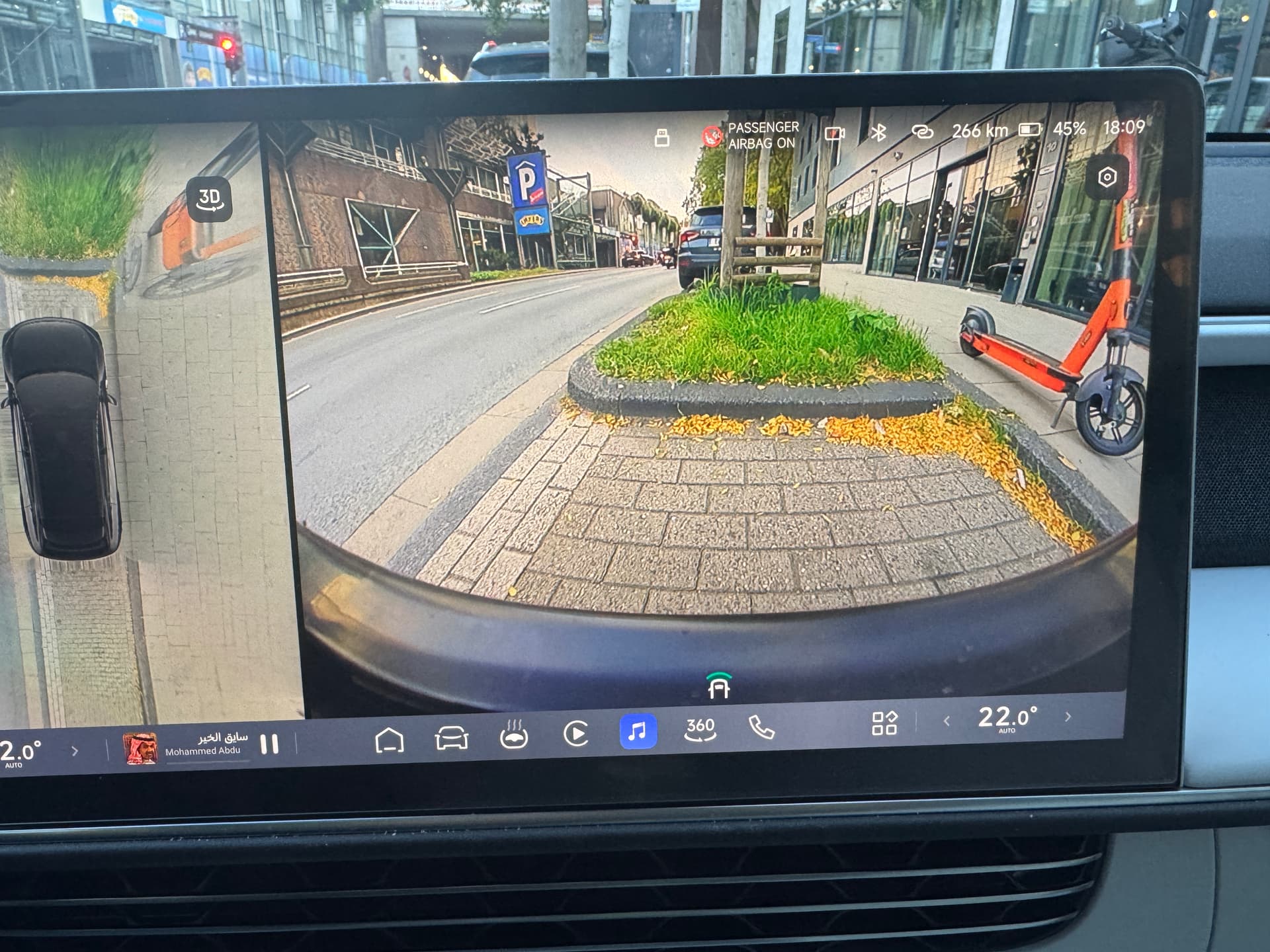 So wie es ausschaut, scheint deine vordere untere Kamera zu tief zu sein. Ich habe zwar auch das Nummernschild im Sichtbereich, aber nicht so viel. Ich zumindest sehe meine Stoßstange nicht. Du aber schon, rechts und links.