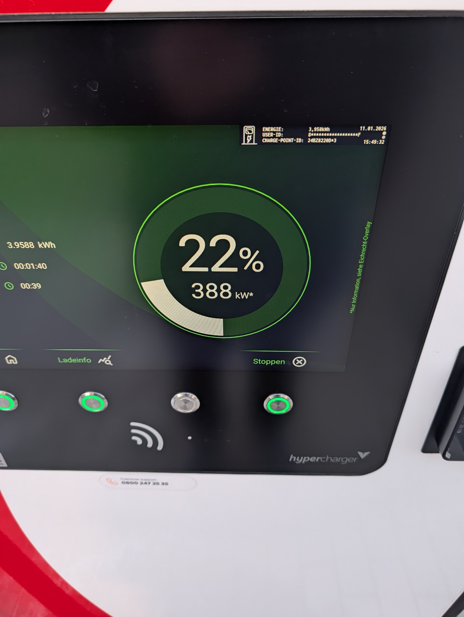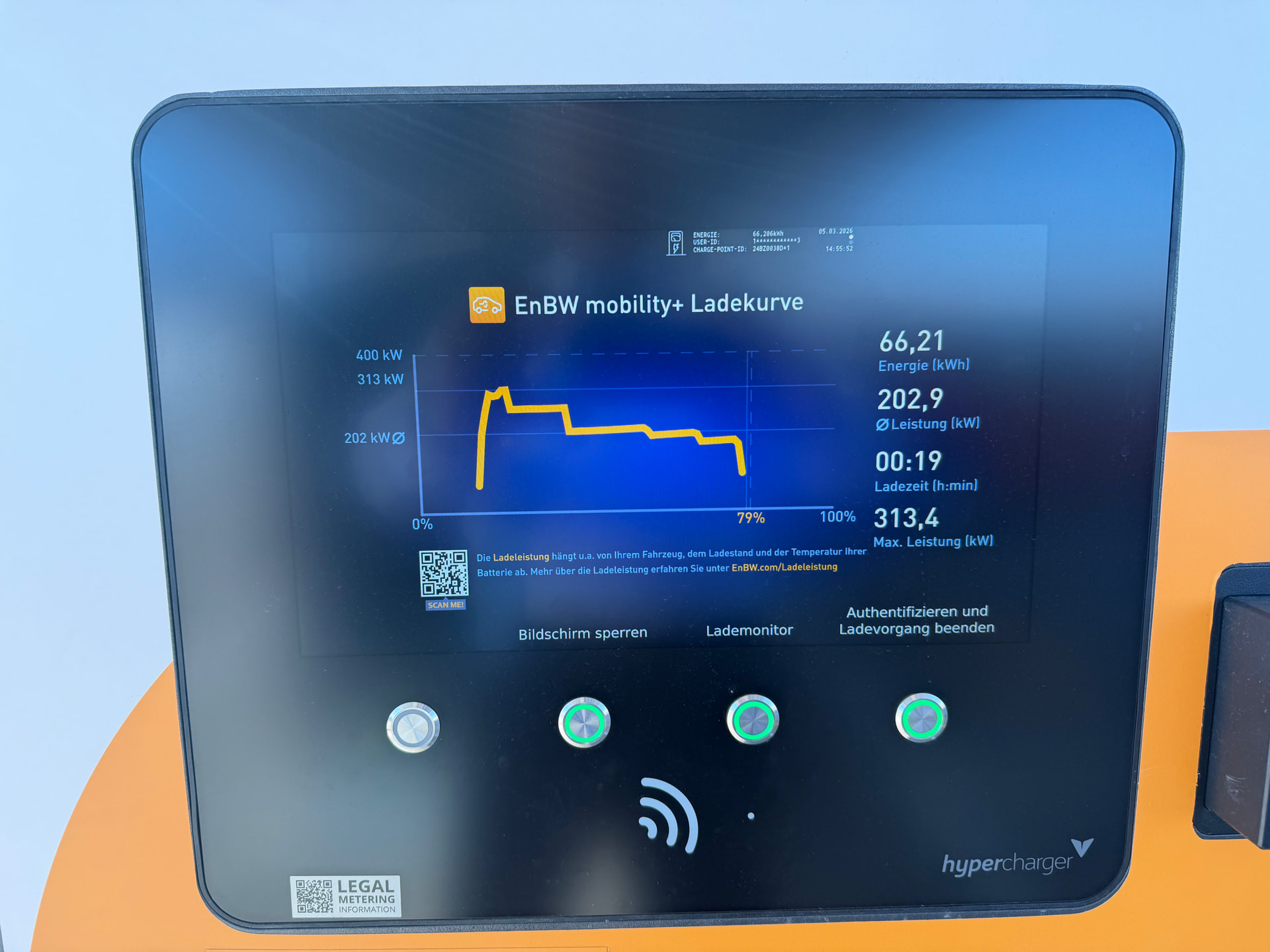 Ich habe gestern auf meiner Überführungsfahrt zweimal bei ENBW geladen. Einmal am 400kW mit maximal 290kW und einmal am 300kW mit 280kW. War auch bisschen enttäuscht ![]()