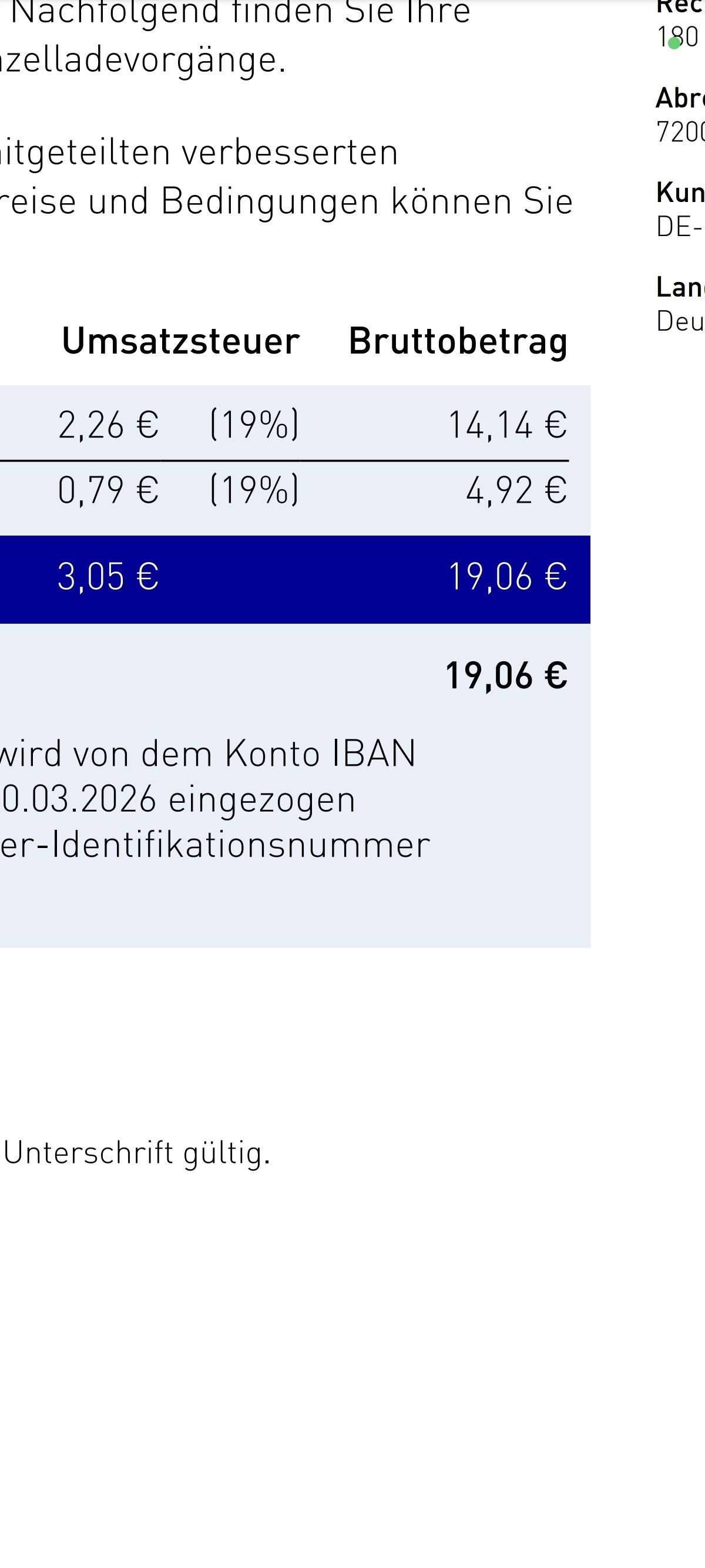 In einem Privattarif bekomme ich auch eine Monatsabrechnung mit den Summen und nochmal aufgeschlüsselt mit den einzelnen Ladevorgängen.