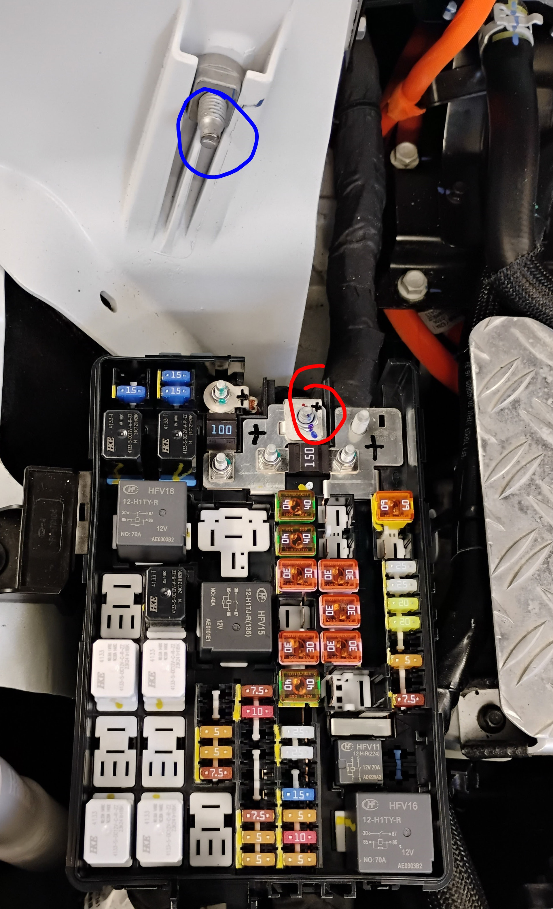 Dort , rot umkreist , kommt das dicke Kabel (von der Batterie im Heck) an .