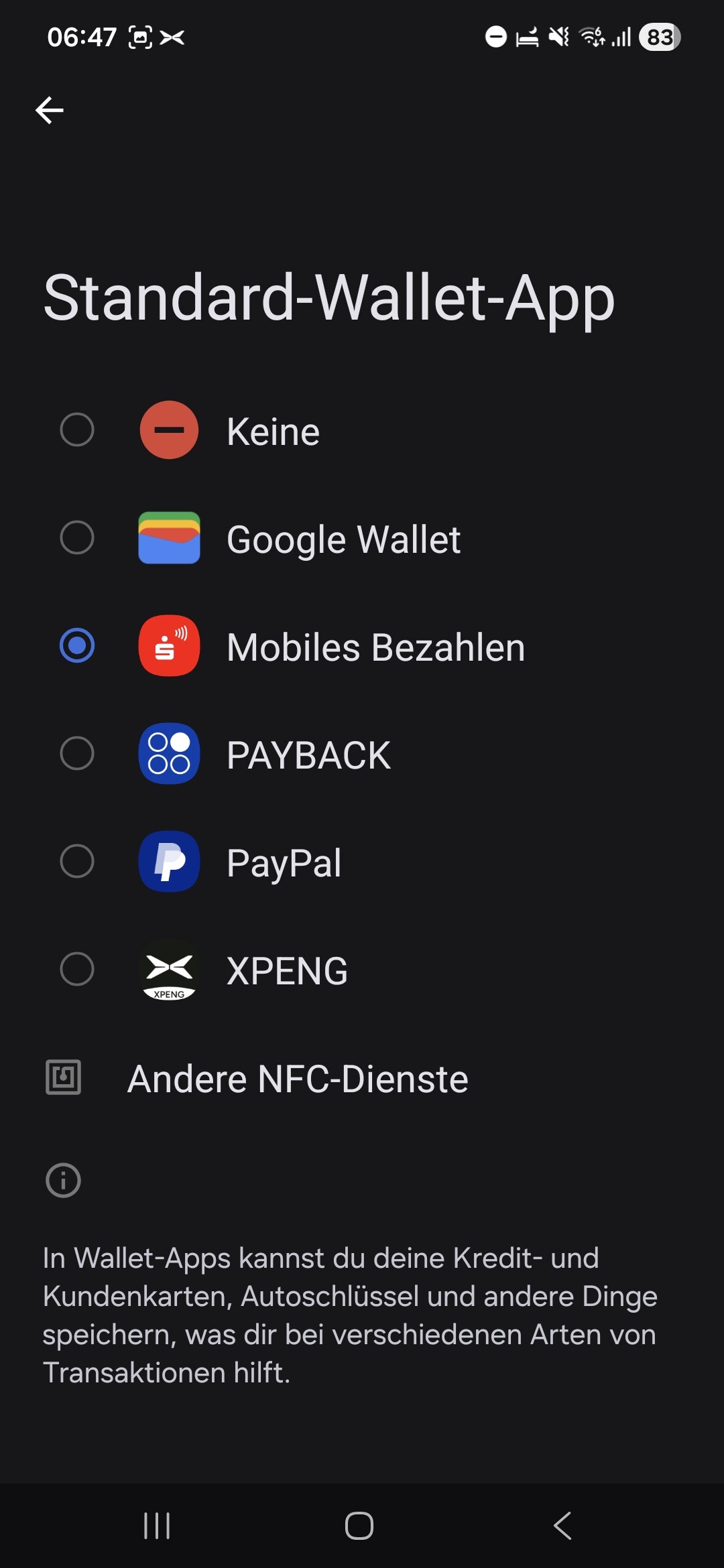 Ich habe mir die NFC Funktion fürs Handy aber nochmal genauer angesehen. Was mir auffällt: Dazu muss ich die Xpeng-App als “Standard App für Zahlungen” auswählen. Da ich dafür aber schon sie Sparkassen App nutze und eine Mehrfachauswahl nicht möglich ist, ist das ebenfalls doof. Oder sitzt das Problem vor dem (Handy-)Bildschirm?