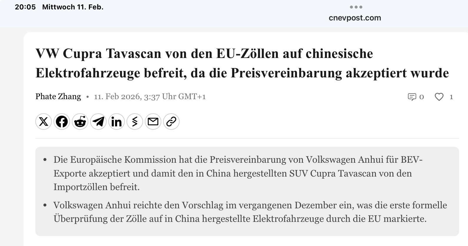 Scheinbar kommt Bewegung in die Sache, sollten 31,7% gewesen sein. Vom Tavascan rollt ja schon das Facelift in China ohne diese hässliche Mittelkonsole. Gut für VW und vielleicht auch Xpeng der Export des ID.EVO könnte sich so rechnen.