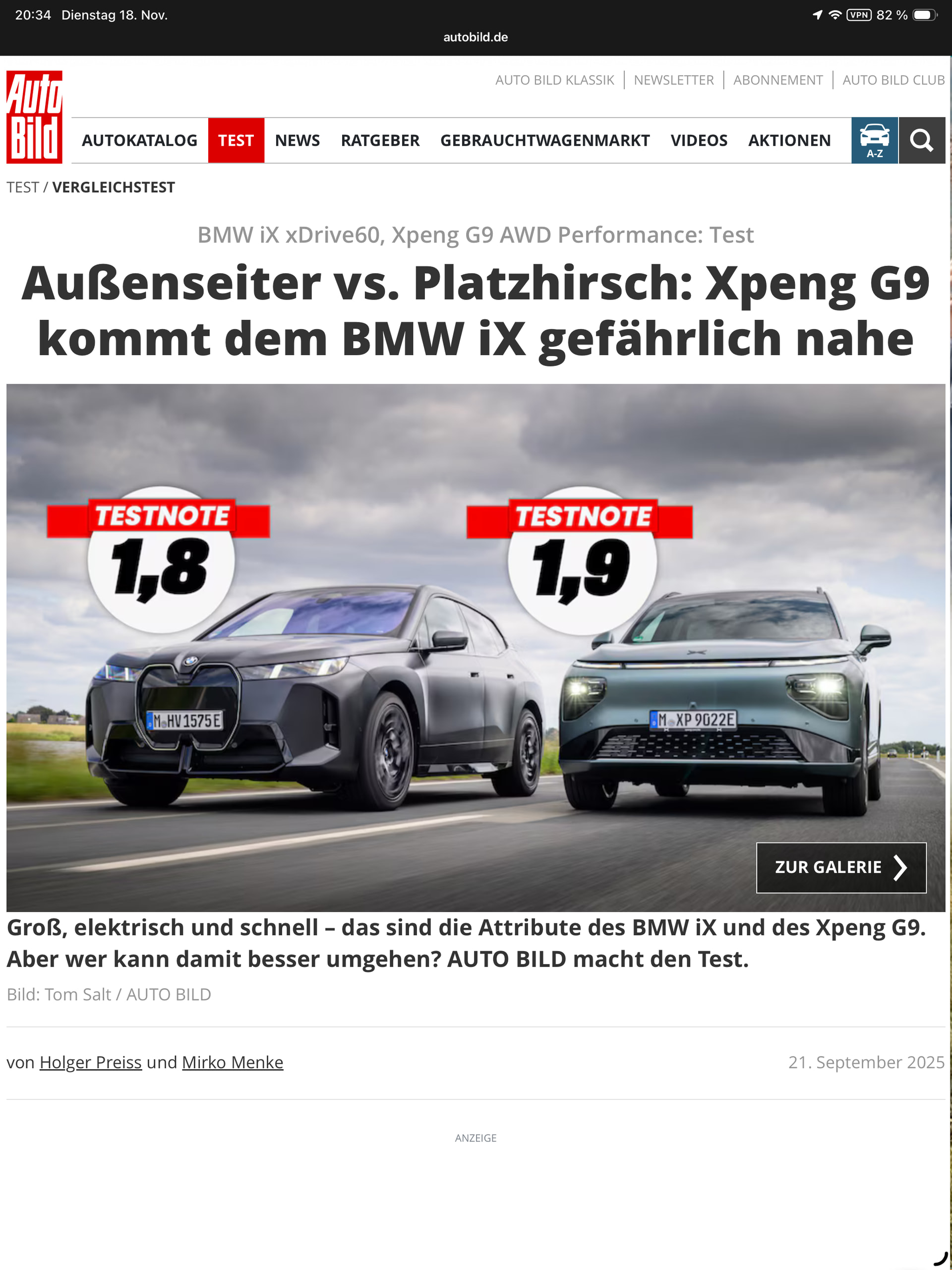 Dann bekam ich einen Auto Bild Test (BMW IX vs. XPENG G9) in die Finger, der mich ob der Bewertung und der Kommentare, der - aus meiner Wahrnehmung - eigentlich stark DE Marken Tendenz der DE Auto-Fachpresse, stark überrascht hat …