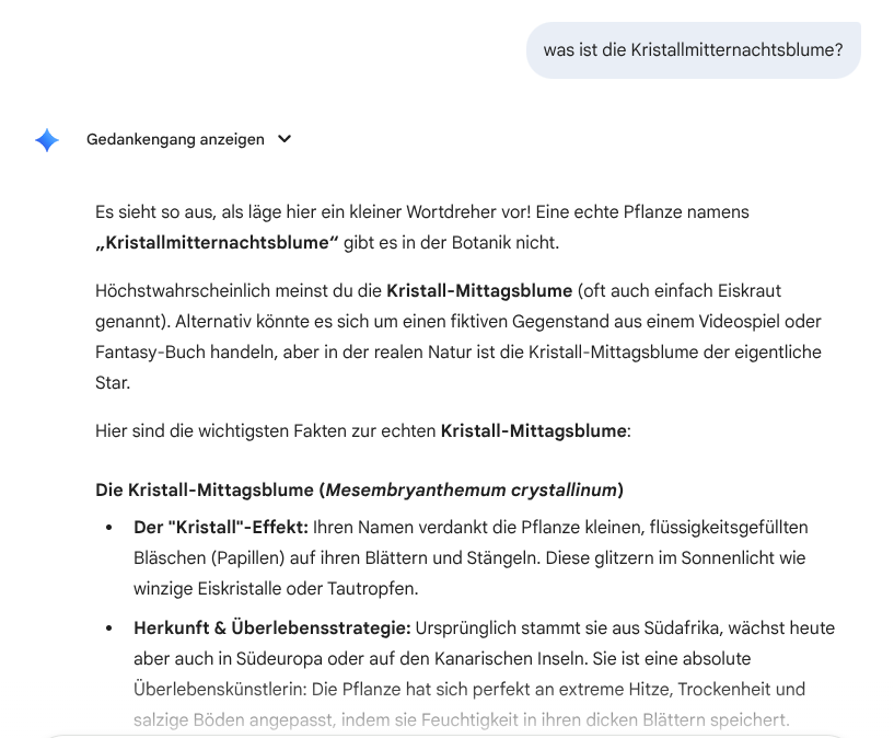 Der Punkt war, dass die KI nicht weiß, was Sache ist, wenn du nach der Kristallmitternachtsblume fragst. Du fragst aber nach der Kristallmittagsblume, was ja der korrekte Name ist.