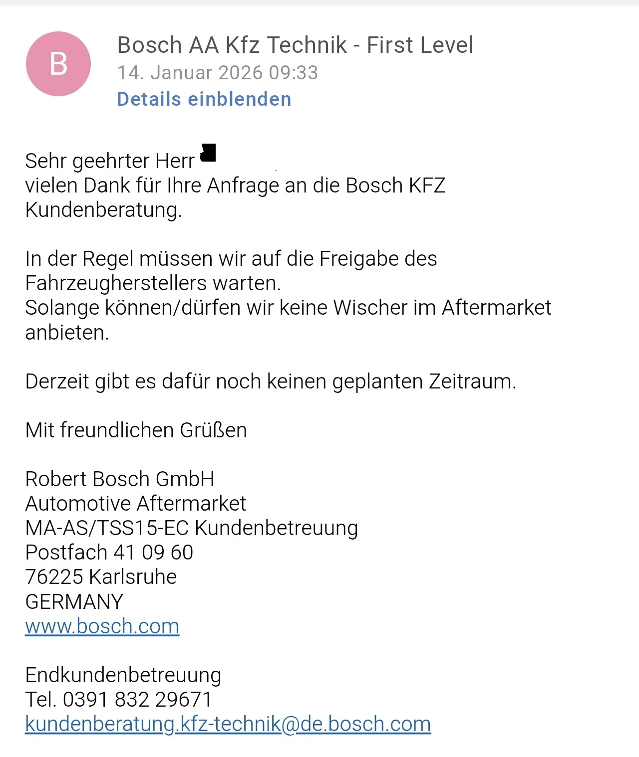 Das alles ist aber in der Automotiv Industrie vs. Aftermarkt ein alter Hut…die Antwort von Bosch wirkt auf mich wie die Ausredenliste meiner Kinder wenn diese ins Bett mussten ![]()