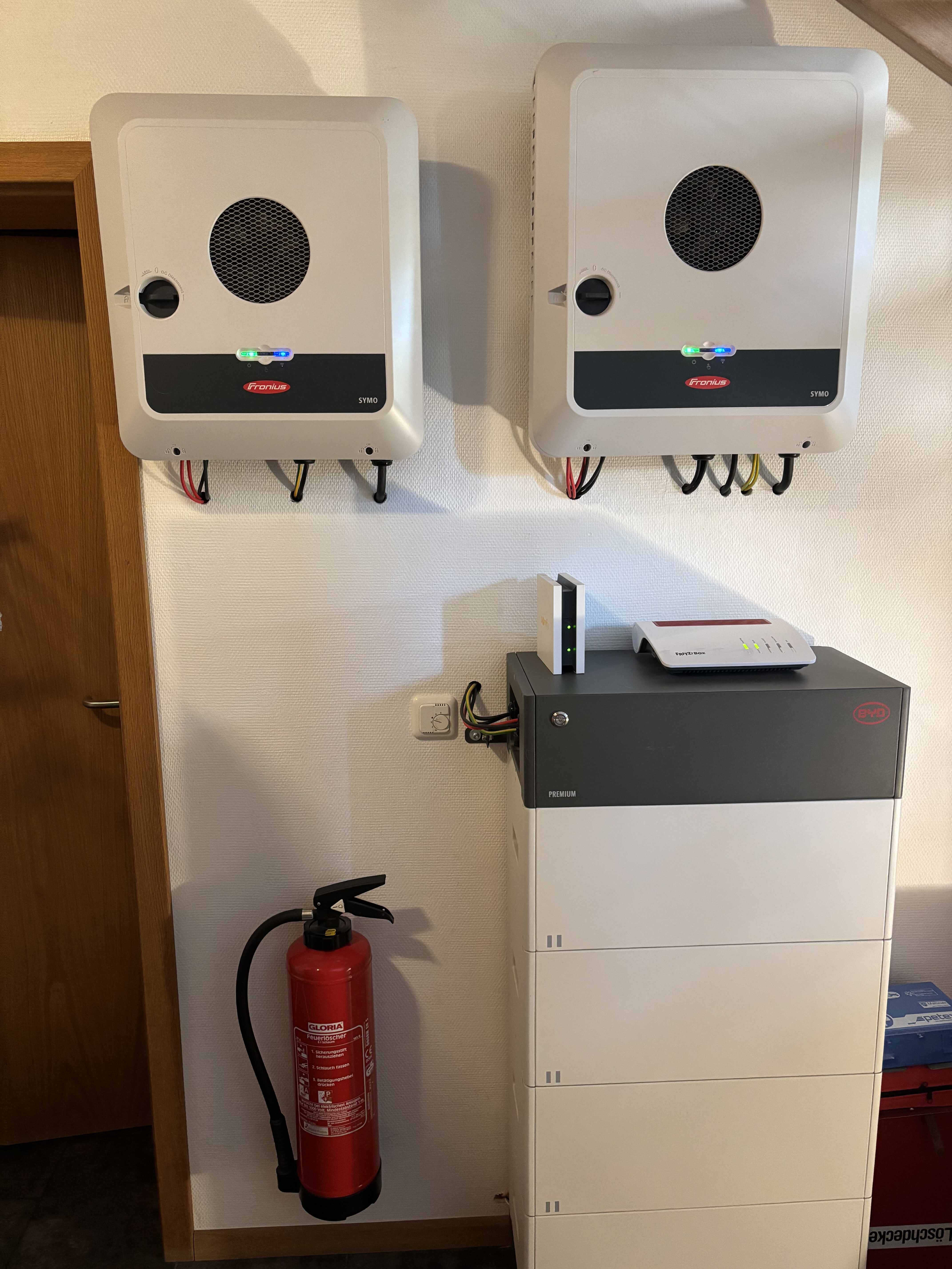 Deswegen habe ich die PV Geräte “außen” direkt an der Wand zum Heizungsraum im Treppenhaus montiert. Dort kann ich sie auch besser sehen und genießen