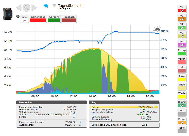 Die restlichen 7 kWp bei uns sind leider halbtags verschattet (Carport) bzw. auf der Nordseite unseres Gartenhauses. Daher haben die eine Effizienz von nicht mal 50% ihrer kWp, was zwar schade ist, aber besser als wenn sie nicht da wären. ![]()