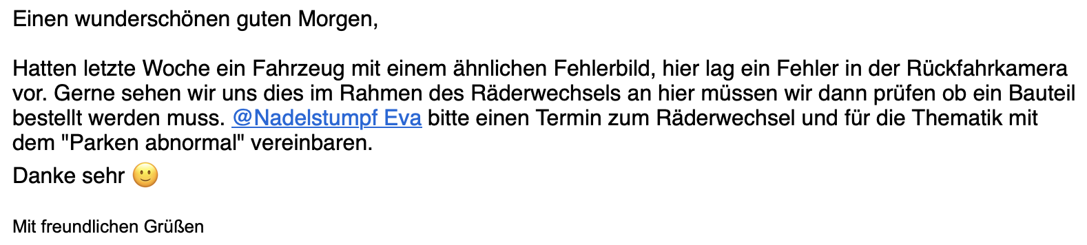 Da wir bereits einen ähnlichen Fall hatten wird das Kamerasystem wahrscheinlich neu eingelesen werden müssen, was inkl. Einlesefahrt ca. 3 Stunden Zeit in Anspruch nehmen wird.