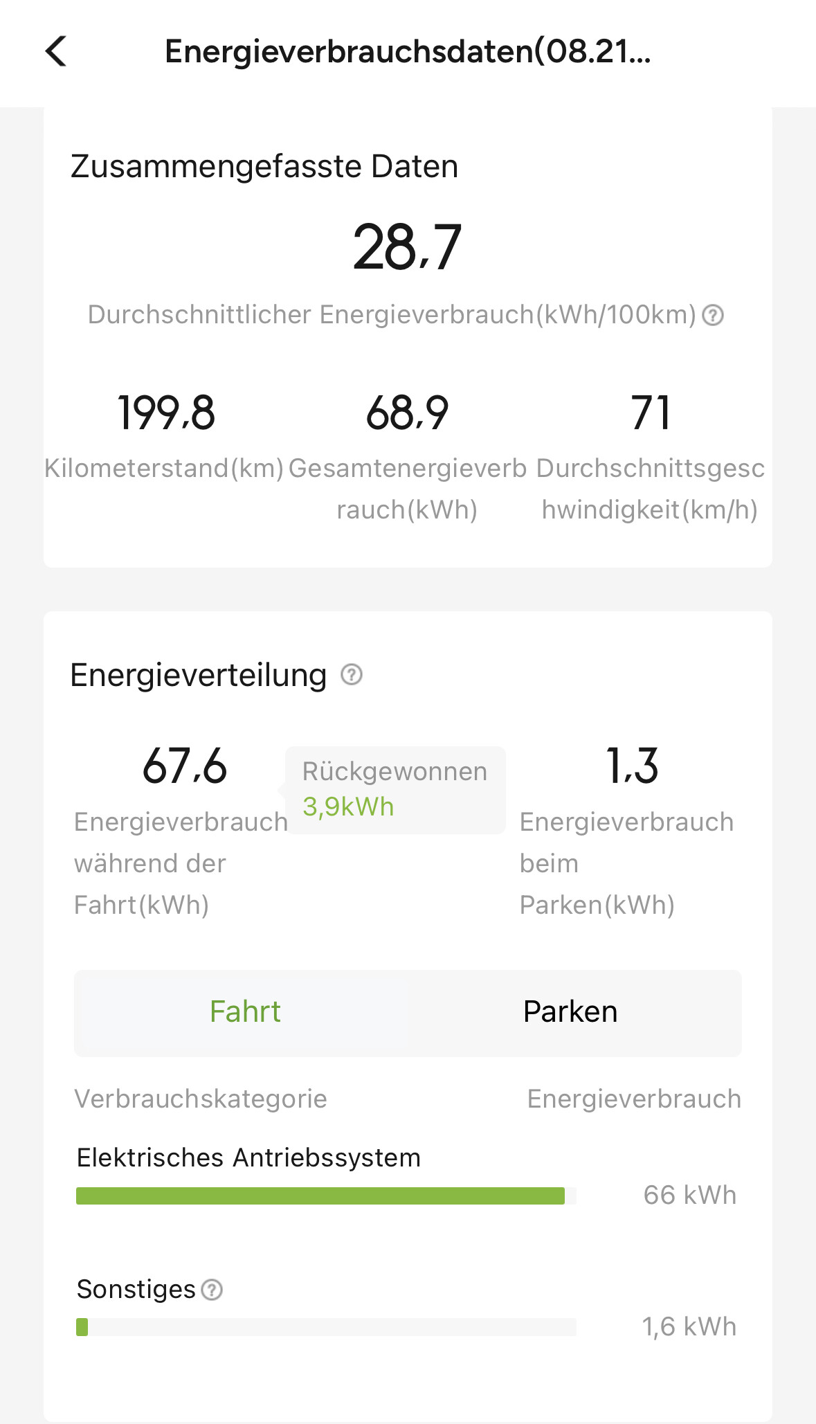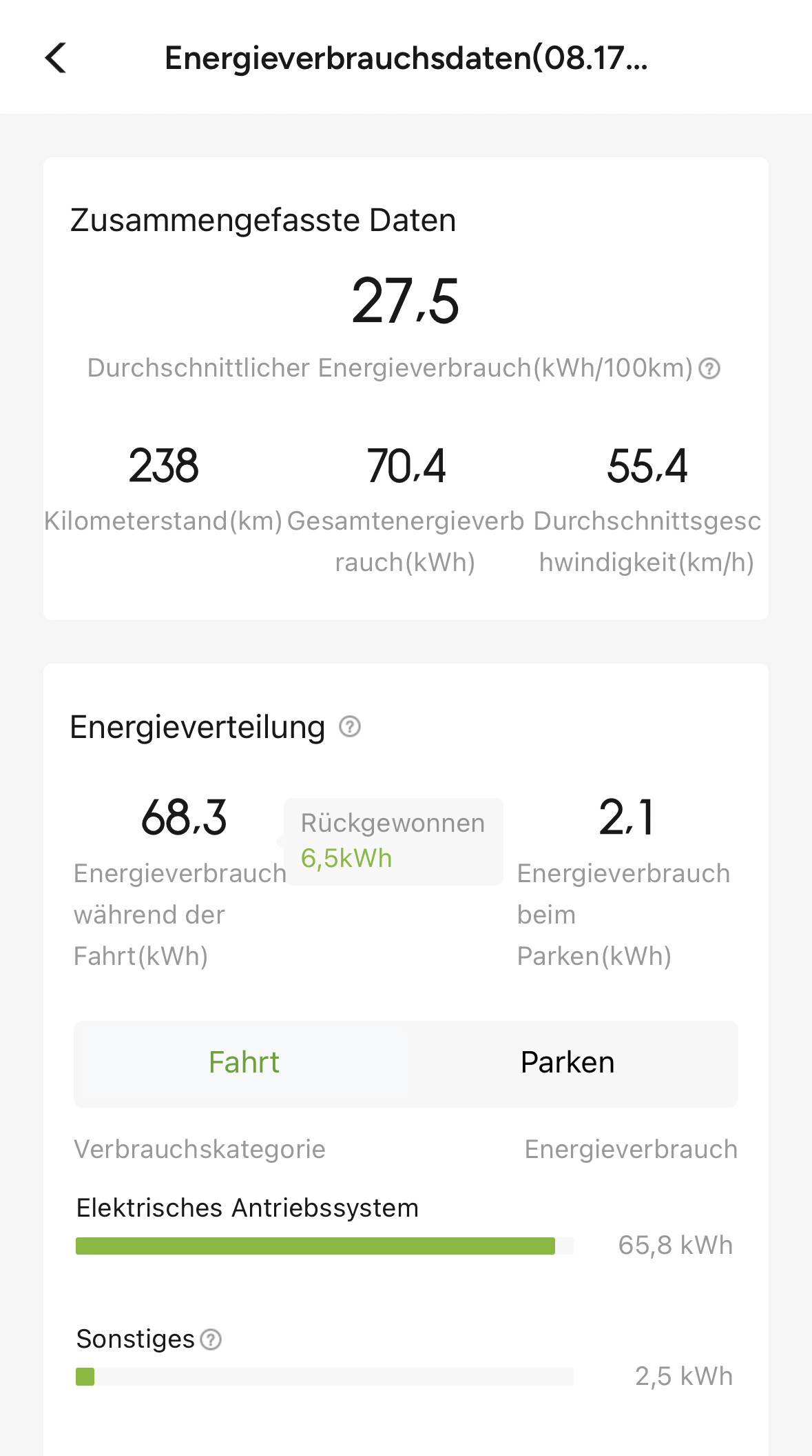Ich hatte dort ein Foto zu gepostet. Hier gerne noch einmal plus Rückweg. 6m Wohnwagen, 1,5T. Auf dem Rückweg etwas schneller, da LKWs unterwegs waren und ich teilweise mit 95 bis 100kmh im Windschatten fahren konnte. Sind dann mit 3% zu Hause angekommen. Ungefähr 2,5km pro 1 % Akku Verbrauch.