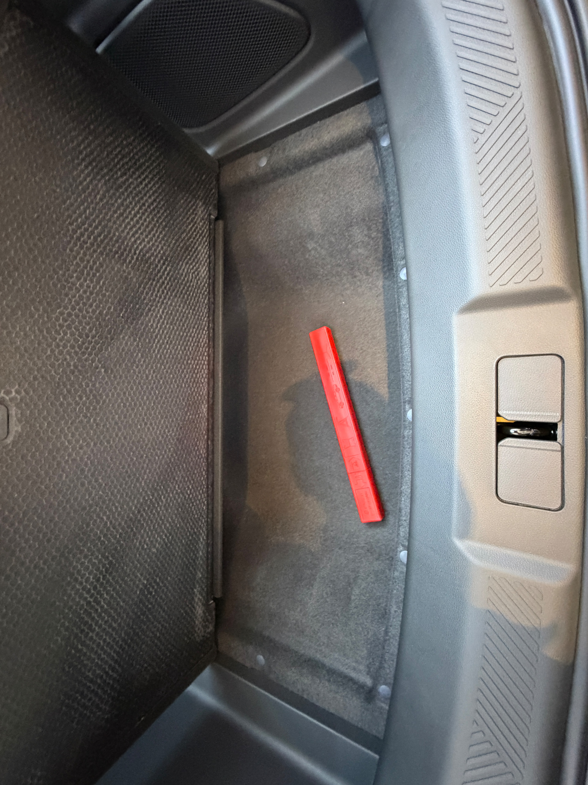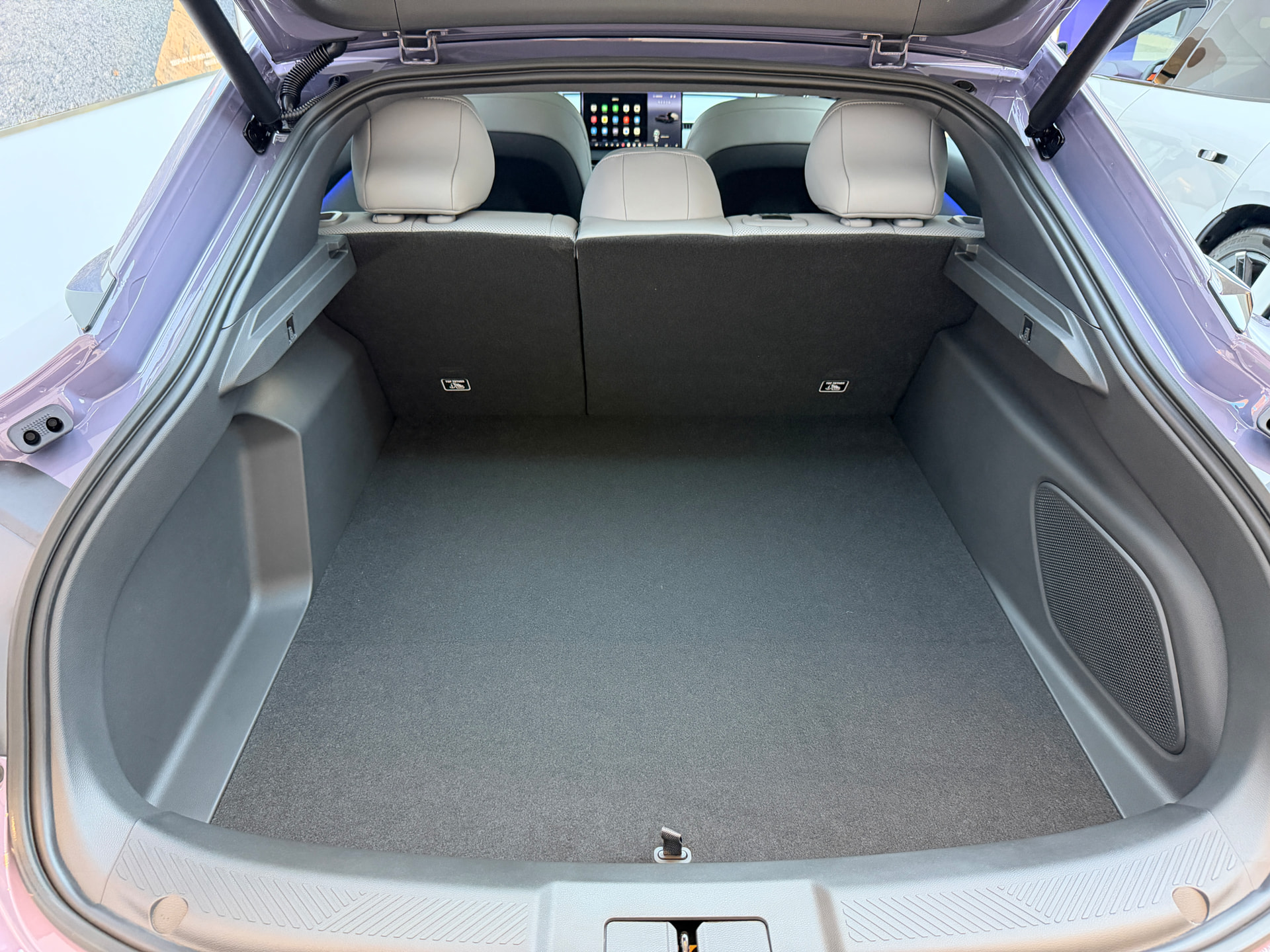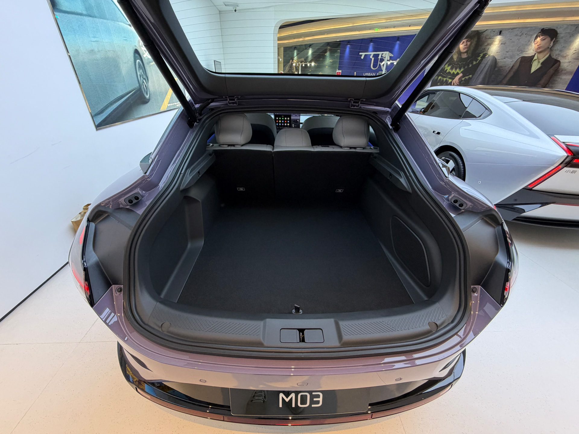 Der Kofferraum öffnet sich wie bei einer typischen Schräghecklimousine. Hat mich stark an meinen früheren Audi A5 Sportback erinnert: Durch das Schrägheck bekommt man bei umgeklappter Rückbank problemlos zwei Fahrräder rein, aufeinandergelegt, das ging beim A5 genauso. Unter der Kofferraumabdeckung gibt es einen doppelten Boden, der tiefer ist als man auf den Fotos vielleicht erkennen mag und noch ein gutes Stück nach hinten geht. Da passt einiges rein, was man nicht lose im Kofferraum liegen haben will. Einen Frunk hat der Mona M03 laut Verkäuferin nicht.
