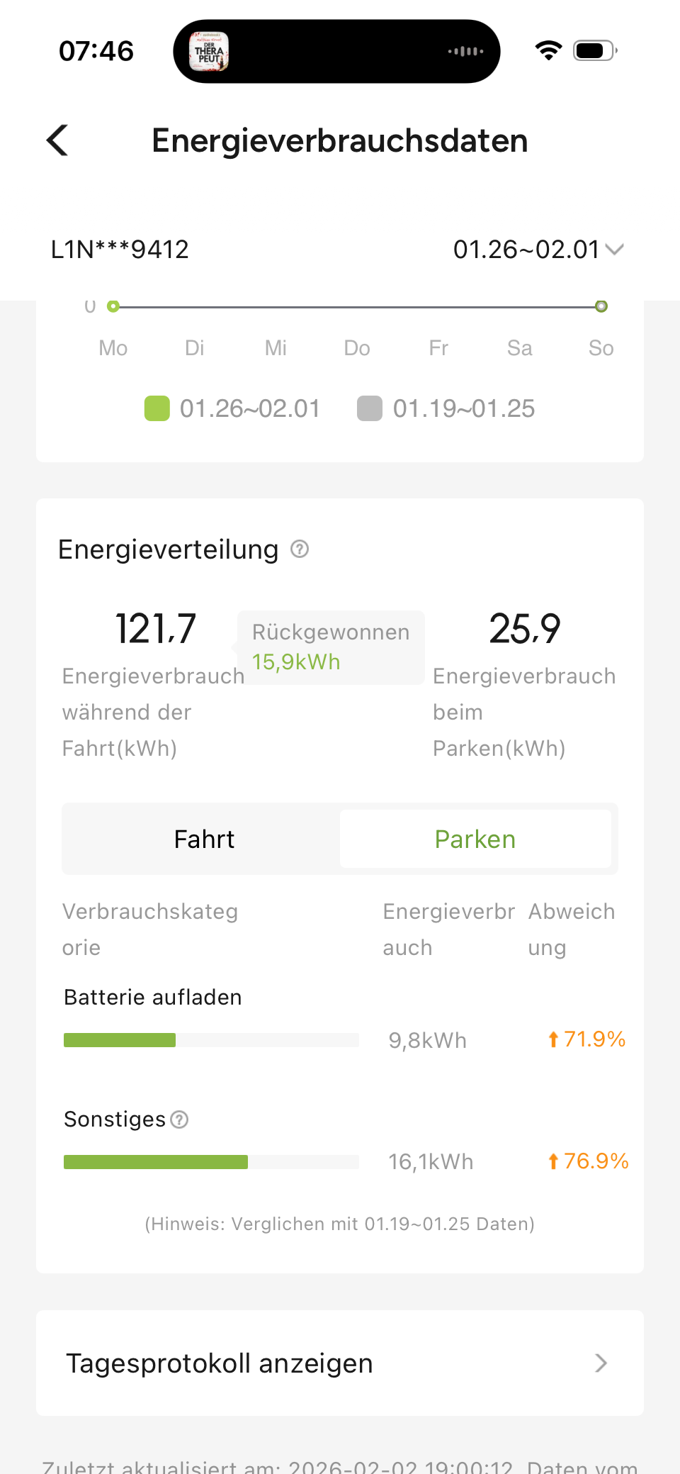 Verbrauch Fahrt <=> Parken nach App: 123 <=> 16.2 kWh - ist schon arg viel. Die 16.2 schlüsseln sich laut App auf: