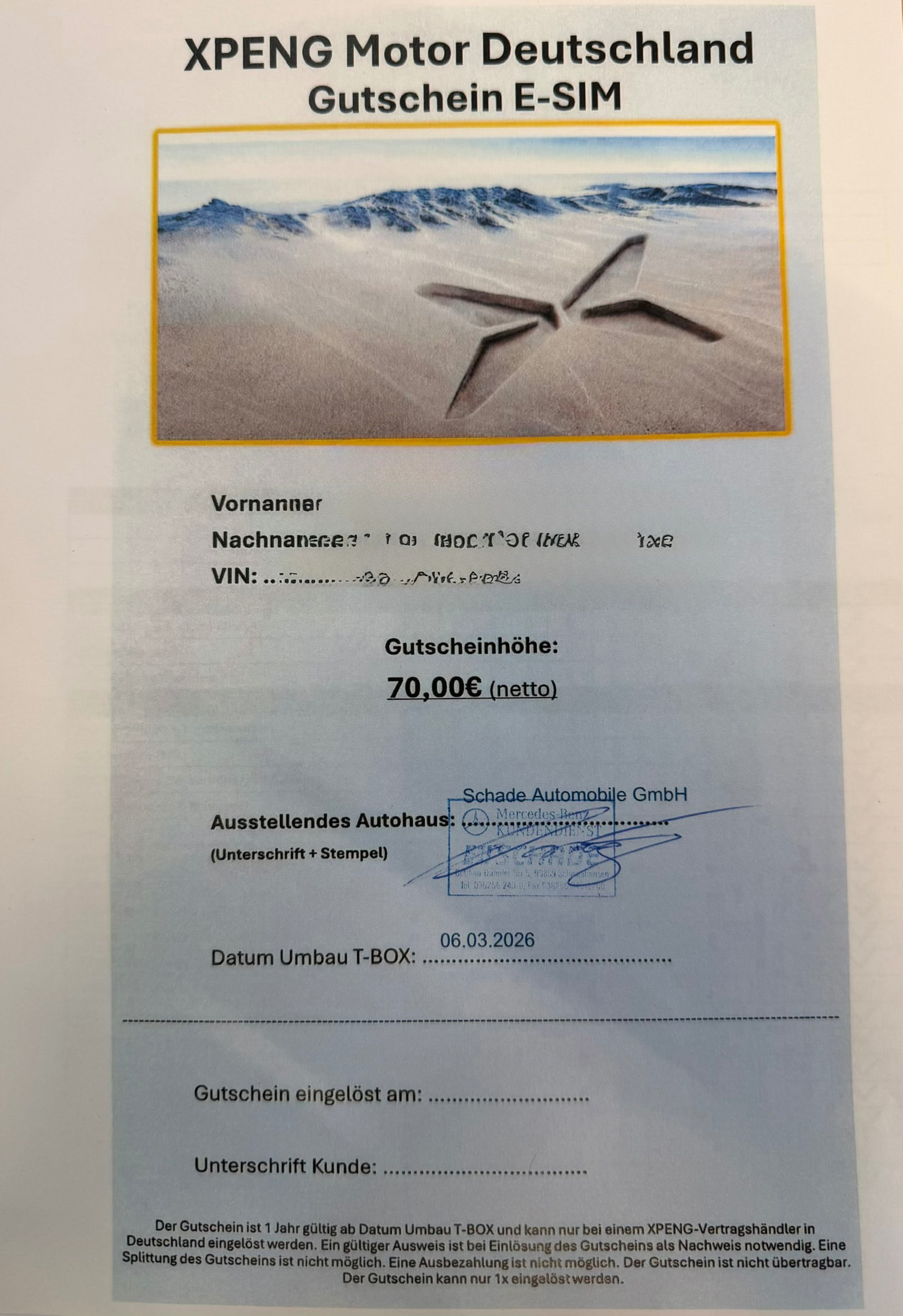 Ich hatte am 8.1.26 meinen T-Box-Wechsel. Aber einen 100-€-Gutschein bekomme ich nicht, da das offenbar irgendwie vor der Aktion bei Xpeng beantragt werden muss (so Hofmann). Aktuell sind es auch keine 100€, sondern 70€.