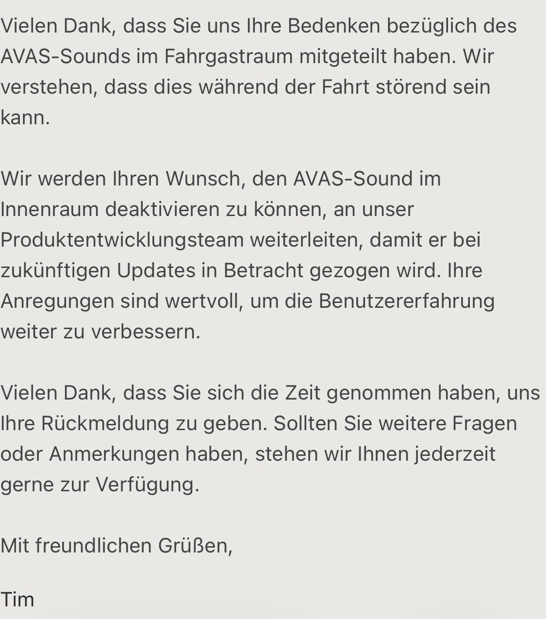 Vielen Dank, dass Sie uns auf die AVAS-Funktion in den 2025-Facelift-Modellen hingewiesen haben. Wir verstehen, dass das Abspielen des AVAS-Sounds über die Innenlautsprecher unnötig und störend sein kann.