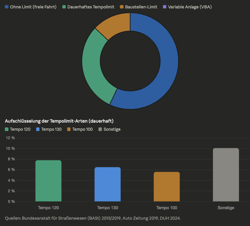 Bei den Strecken mit dauerhaftem Tempolimit ist am häufigsten Tempo 120 (7,8 Prozent) und Tempo 100 (5,6 Prozent) vorgeschrieben. Insgesamt gab es 2019 unbegrenzte Fahrt auf 57,2 Prozent oder 7.546 km des 13.192 km langen Autobahnnetzes, auf 30 Prozent war das Tempo dauerhaft beschränkt (3.958 km) und auf 12,8 Prozent der Strecken gab es eine Begrenzung wegen Baustellen (1.689 km)