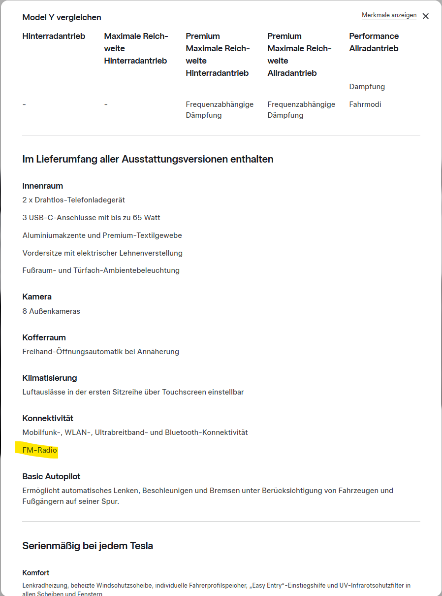 Lenkradheizung, FM-Radio, Digitalradio (Ob DAB+ oder Streaming weiß ich nicht, meiner aus 2023 hat DAB+) und Autopilot haben sie alle, auch der Standard-Y.